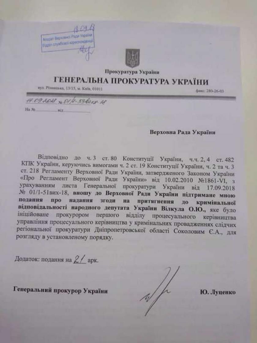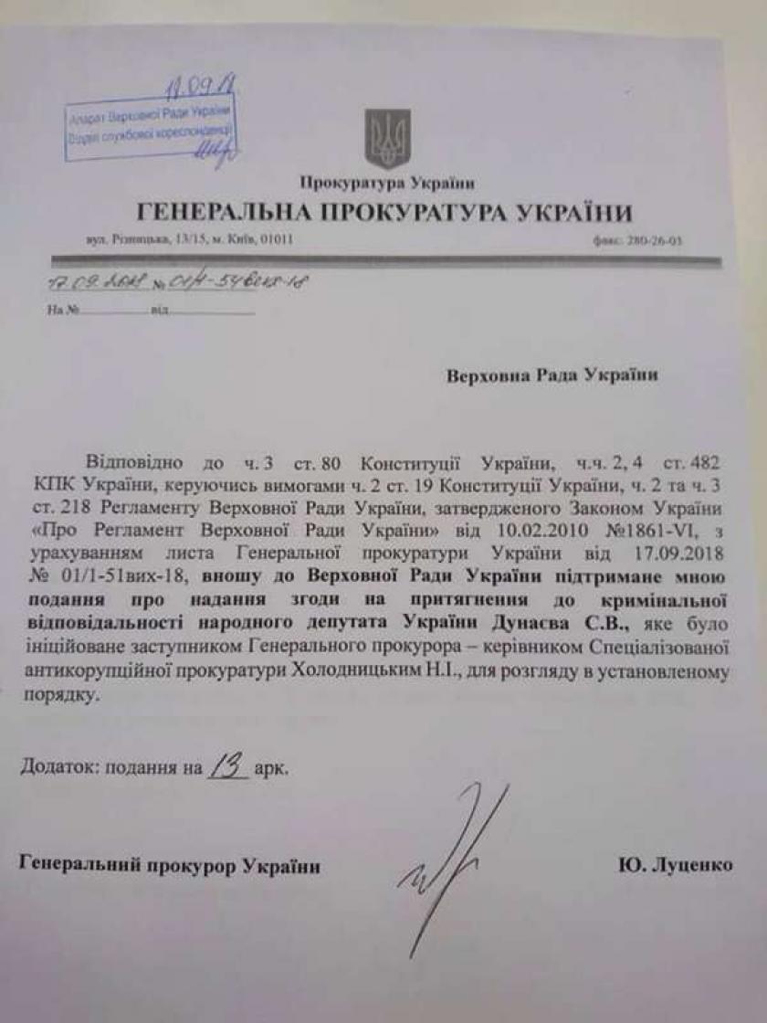 15 мая 2018 года Луценко уже подавал в парламент ходатайство о снятии неприкосновенности с "оппоблоковца" Сергея Дунаева, 25 мая Генпрокурор внес в аппарат Верховной Рады представления о даче согласия парламента на привлечение к уголовной ответственности депутатов от "Оппоблока" Дмитрия Колесникова и Александра Вилкула. Однако документы ему вернули.