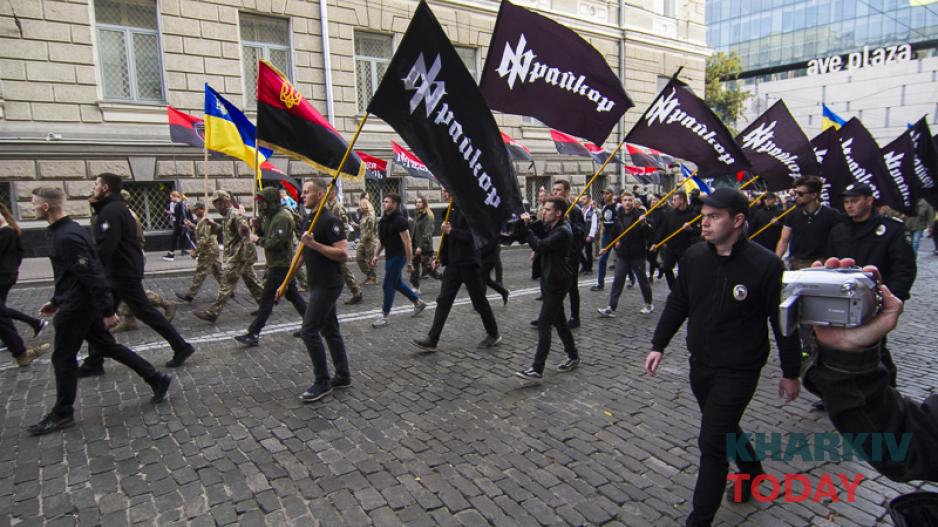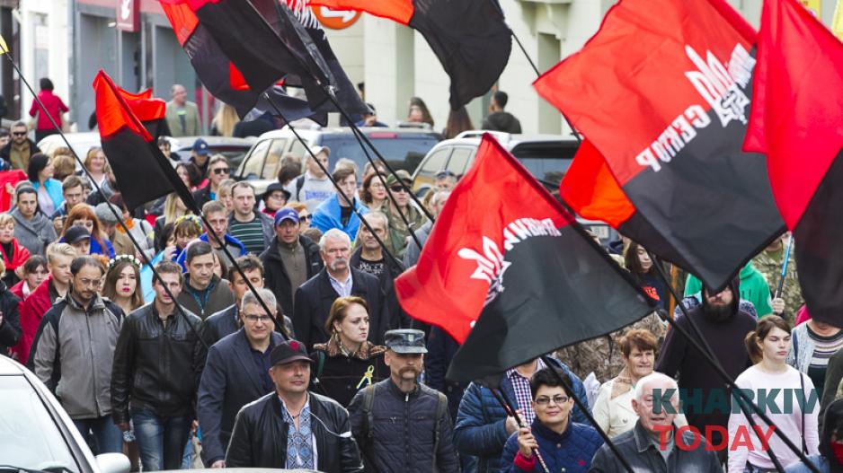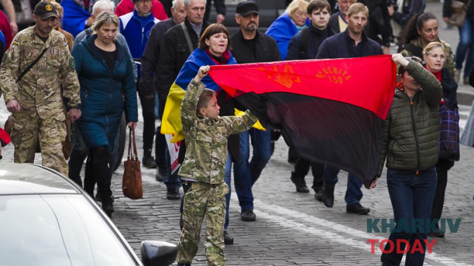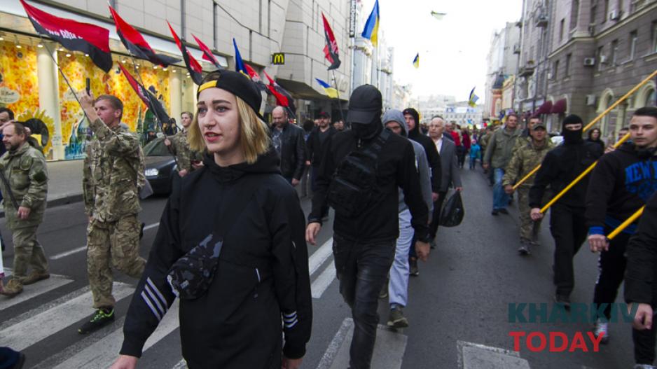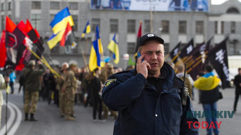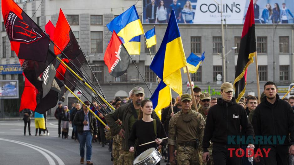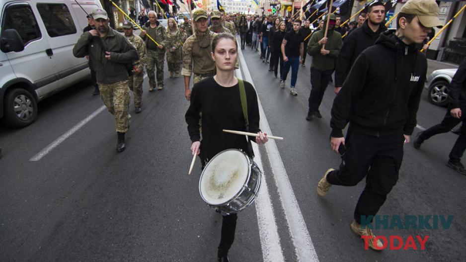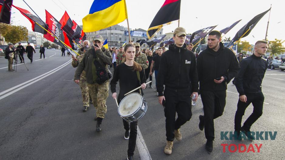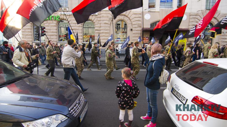 14 октября, в День Защитника Украины, Украинского казачества и создания УПА, представители правых организаций прошлись маршем по центру Харькова. Шествие началось в 16 часов на площади Конституции - там собралось больше сотни участников с флагами, в основном - члены организаций "Правый сектор" и "Фрайкор". Они двинулись по Сумской под барабанную дробь. Полицейские перекрыли улицу и сопровождали колонну.