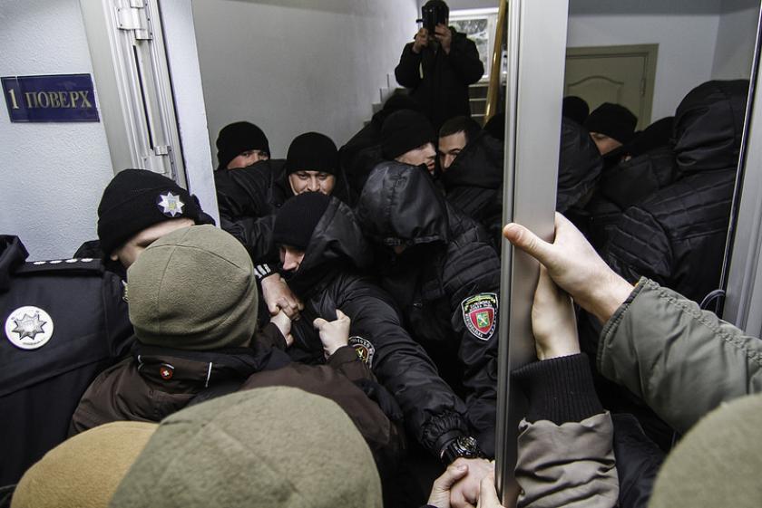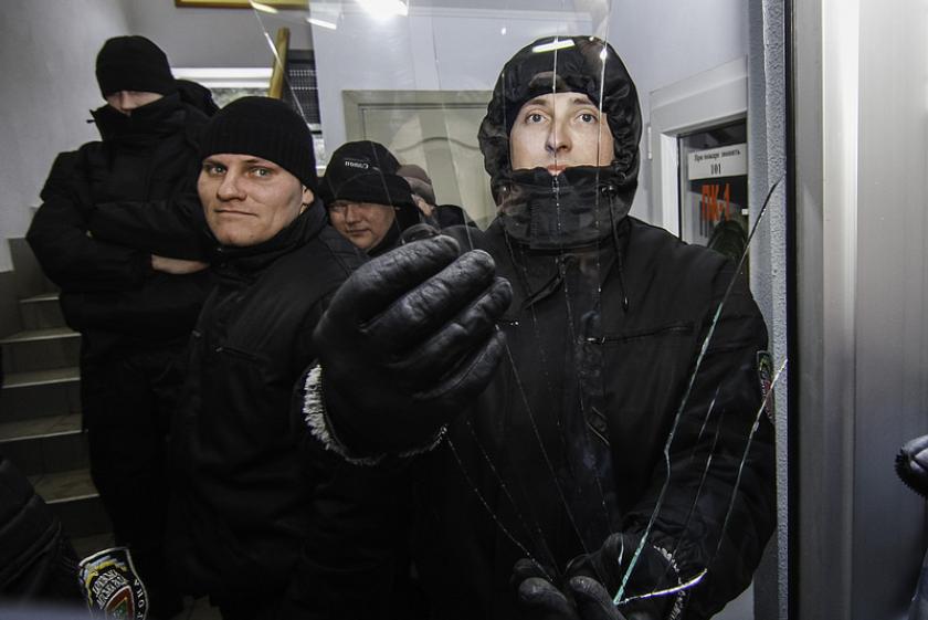 Во время потасовки было выбито стекло в двери. Со второй попытки люди сломали двери и прошли на третий этаж, где проходят общественные слушания.
