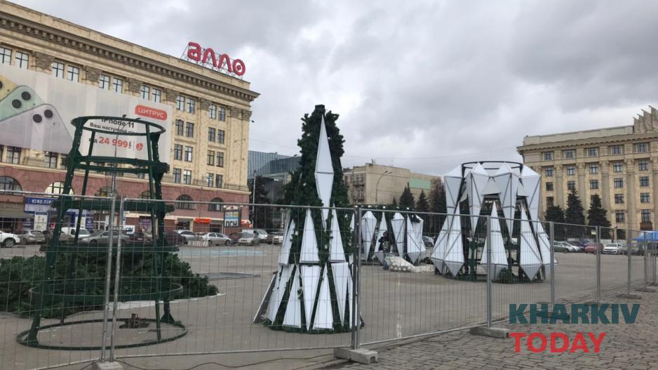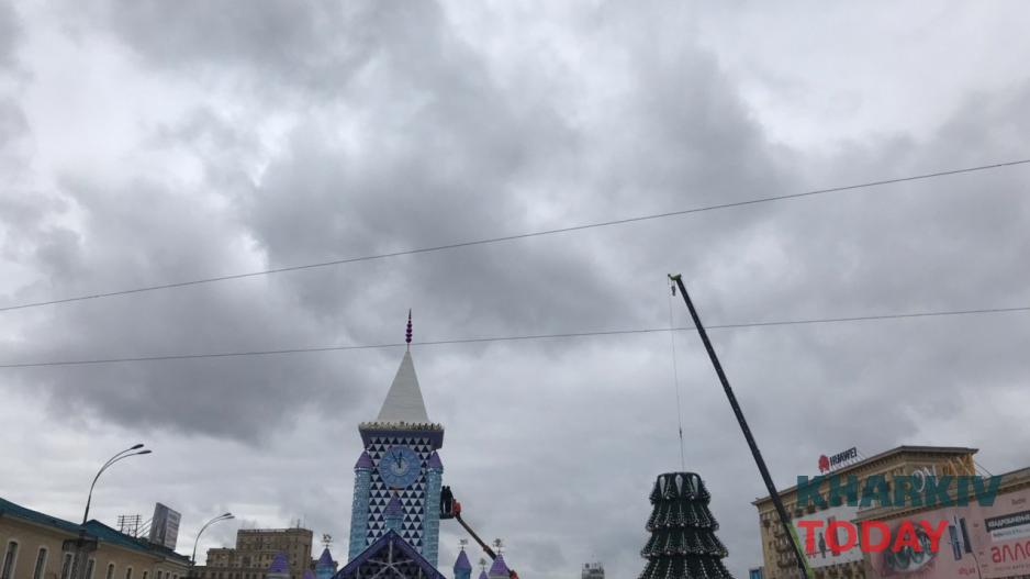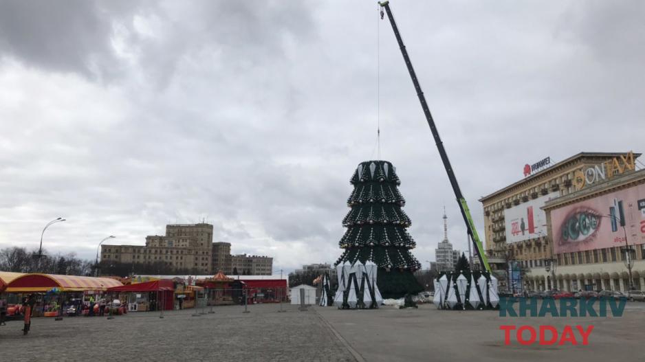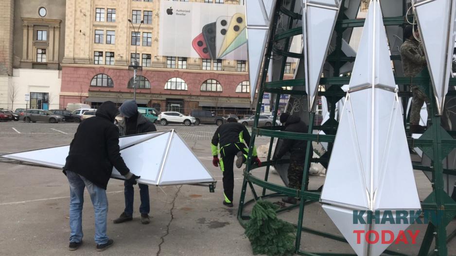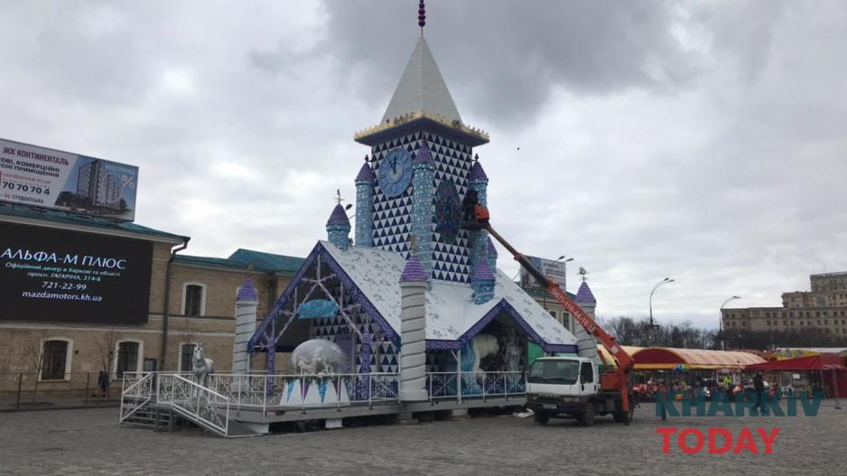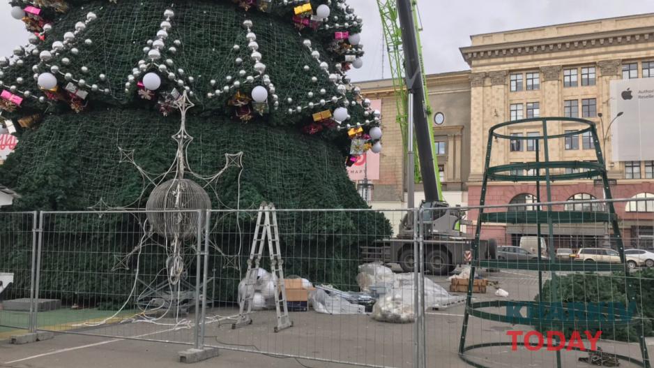 4 февраля в центре Харькова начали разбирать новогоднюю атрибутику. Рабочие уже демонтировали часть главной елки города. К домику Деда Мороза также пригнали подъемный кран.