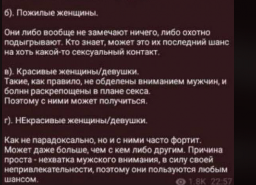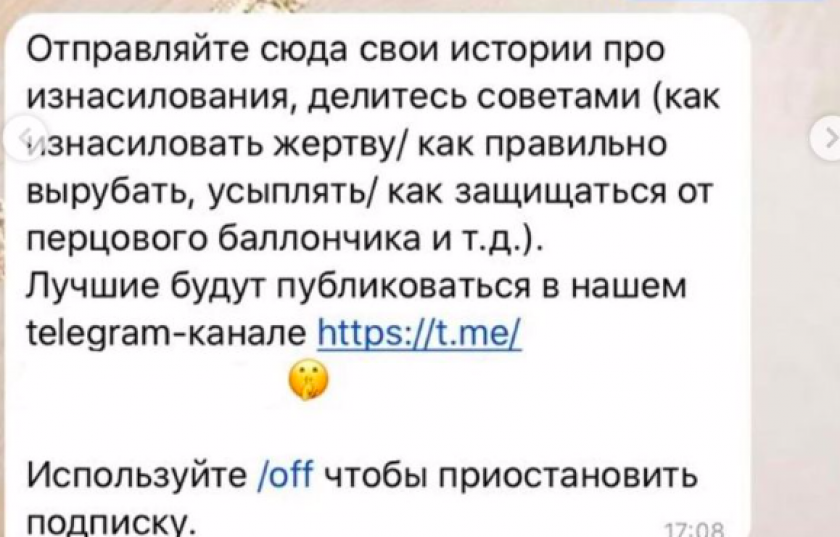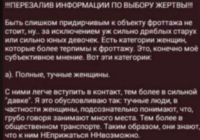"Это был канал в Telegram, который администрировался гражданином России. Очевидно, автор – не совсем здоровый гражданин. Он создал канал, в котором описывал, как правильно выбирать жертву, знакомиться с ней, описывал, как бы он ей причинял насилие. Скорее всего, если говорить именно о насилии, он его не совершал, но он пропагандировал насилие над женщинами и детьми. Это видно на скриншотах – он выставлял фотографии двух жертв и велось обсуждение, кого "помучить" первой, кого второй. Какой у нее там ротик и так далее", – рассказал Марков.