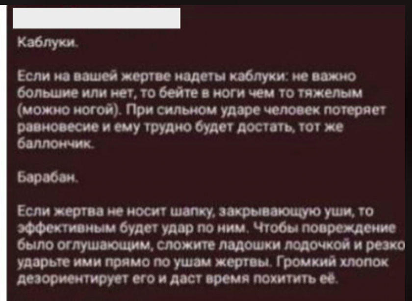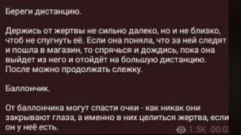 Канал представлял собой чат, пользователи которого делились друг с другом советами о выборе жертвы, слежке за ней, выборе снотворных препаратов с целью "накачать" ее и дальнейшим насильственным действиям.