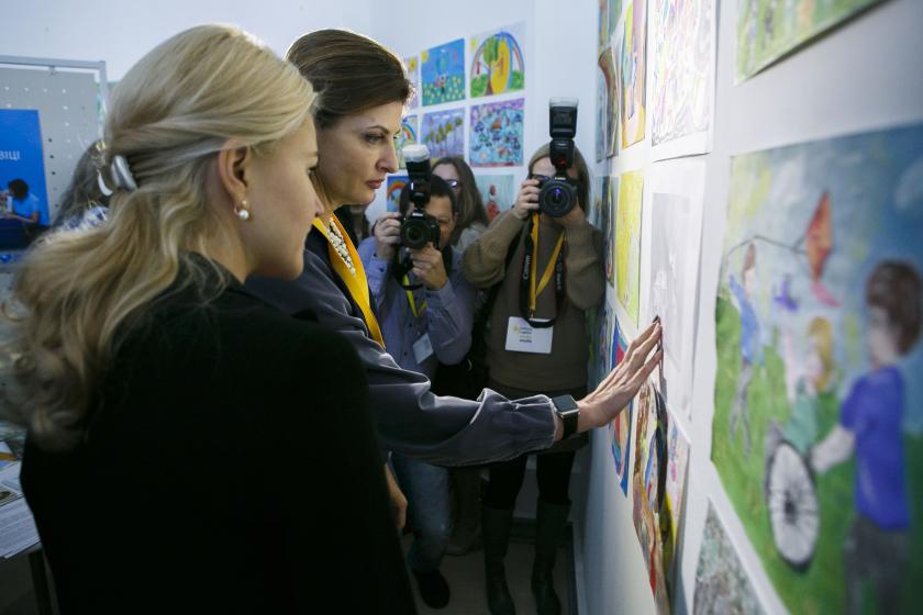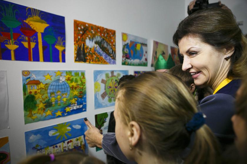На встречу с первой леди в Школу архитектуры приехала глава Харьковской областной государственной администрации Юлия Светличная, которая пошла смотреть детские рисунки.