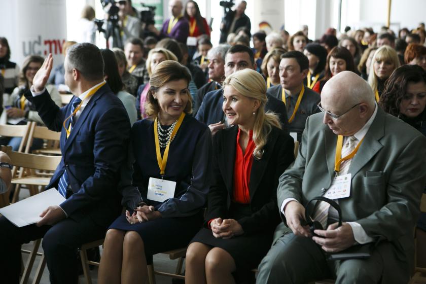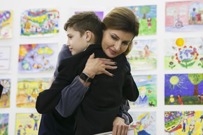 10.57 Прибыла Марина Порошенко. Вместе с Юлией Светличной они пошли посмотреть выставку рисунков. Марина Порошенко сфотографировалась с ребенком.