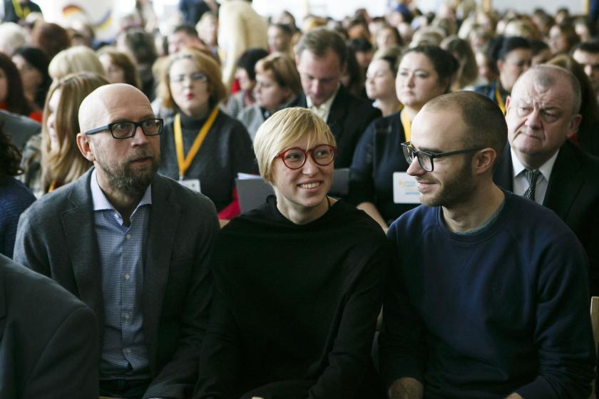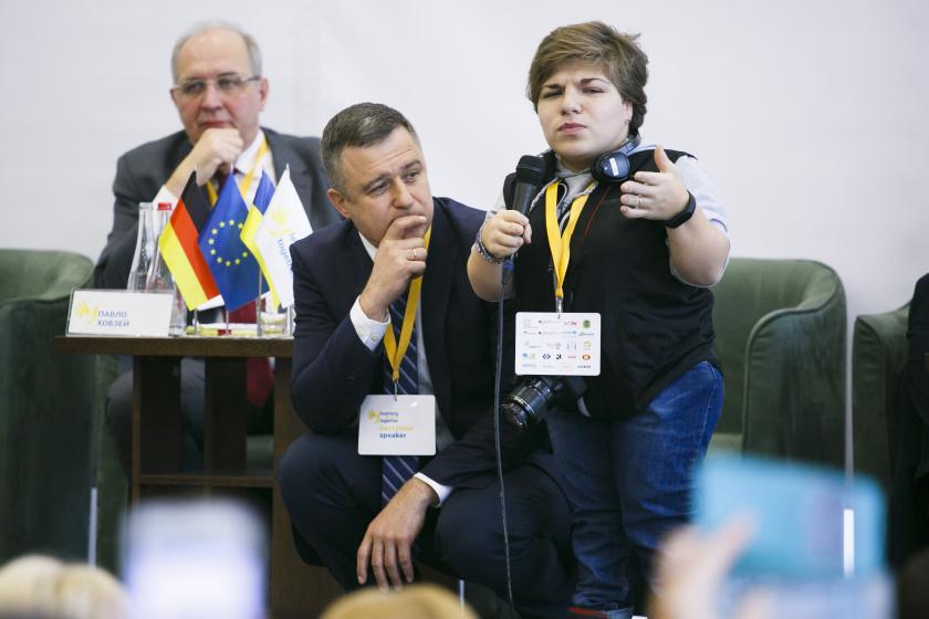 12.31 "Инклюзия - это не про пандусы вообще-то. Это об отношении к людям с особенными потребностями" - сказал Николай Кулеба и попросил выйти на сцену Ирину Ларикову, девушку с особенными потребностями (инвалидность первой группы) и воспитанницу общественной организации "Эммаус". Он попросил девушку объяснить, есть ли инклюзия в Украине.