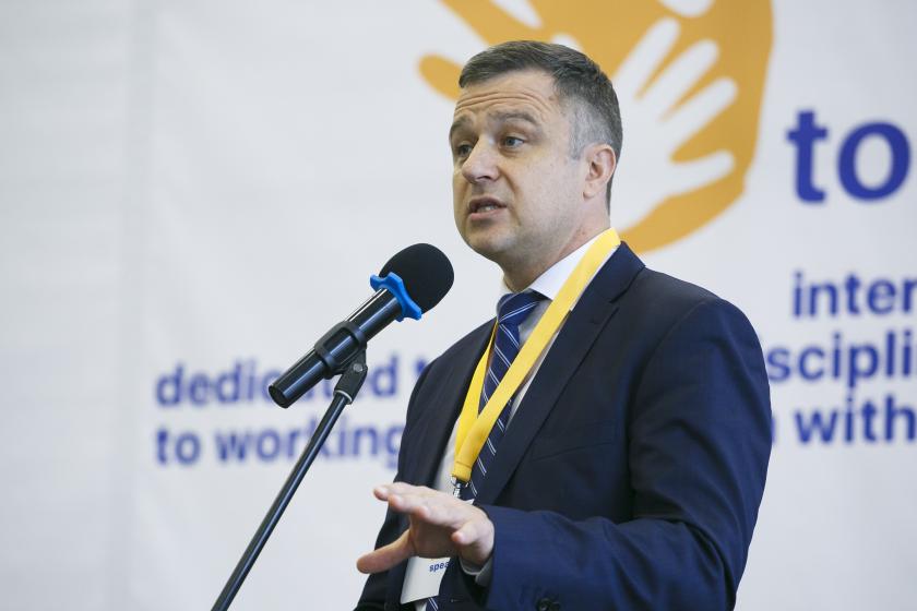 11.39 "Я сегодня встречался с представителями соцслужб. И хочу рассказать историю мальчика, которого с рождения бросила мать. У него целый букет диагнозов. Гидроцефалия и прочее. В шесть лет его должны были перевести в интернат. И женщине, которая работала там юристом, выпала доля оформлять его в интернат. И она ходила по этой комнате, и мальчик почему-то называл ее мама. Она пошла к своему мужу и попросила его взять мальчика к себе. Ему сегодня 15 лет. Они нашли школу, которая его приняла. Сейчас он мечтает стать поваром. Это яркий пример того, что если каждый не будет равнодушным, это может спасти жизнь ребенка. Я считаю, что у украинцев большой потенциал. Мы должны сегодня вкладывать в это дело сердце и душу и не быть равнодушными, и мы сделаем жизнь этих детей ярче и лучше", - рассказал Николай Кулеба, уполномоченный Президента Украины по правам ребенка. Во время своего спича Кулеба дважды прерывался, так как у него на глаза наворачивались слезы, пил воду.