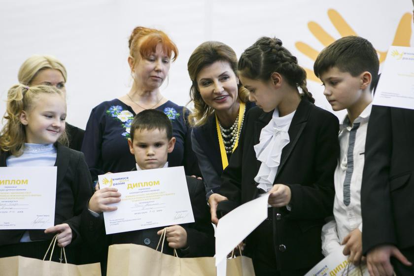13.04 Началось награждение победителей конкурса детского рисунка "Живем вместе-меняем мир". Грамоты и призы вручали Марина Порошенко и Юлия Светличная. Всего в конкурсе принимали участие более 300 работ.