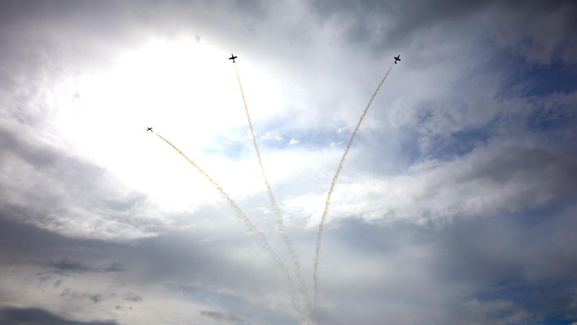 Реактивные самолеты Л-29 кружили над Харьковом под управлением летчиков Харьковского аэроклуба Сергея Филатова, Сергея Комина и Анатолия Бернатовича.