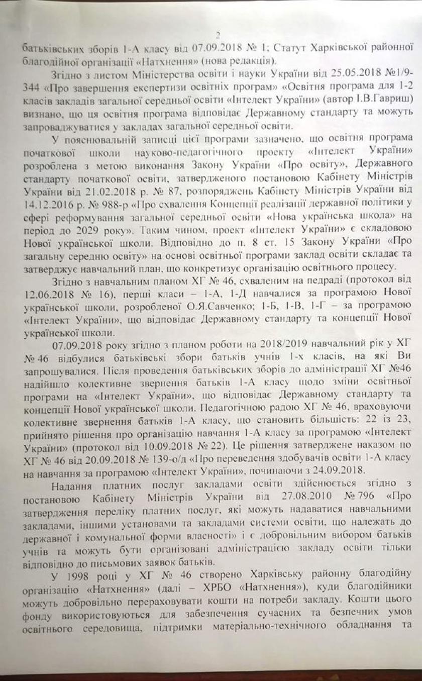 Две недели дети учились, привыкали к одноклассникам и школьной жизни. 13 сентября родителям 1-Д класса, где обучение проходило по НУШ, сообщили, что их переводят на программу "Интеллект Украины". Якобы родители сами написали заявления о переводе детей на другую учебную программу. В ответ родители возмутились, написали жалобу в Департамент образования Харьковского горсовета, районо и Мнистерство образования и обратились за помощью к правозащитникам.