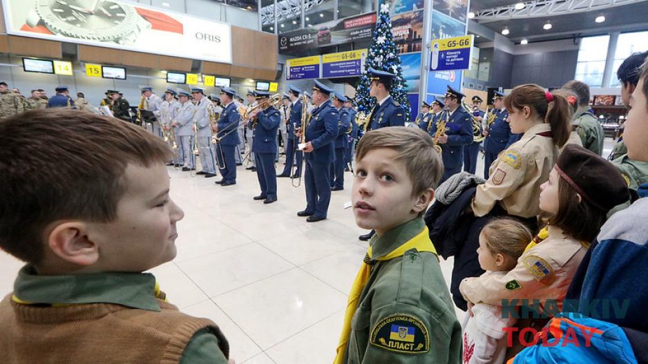 Кроме пассажиров Харьковского аэропорта, на выступление оркестра пришли участники боев за Донецкий аэропорт, пластуны и школьники.