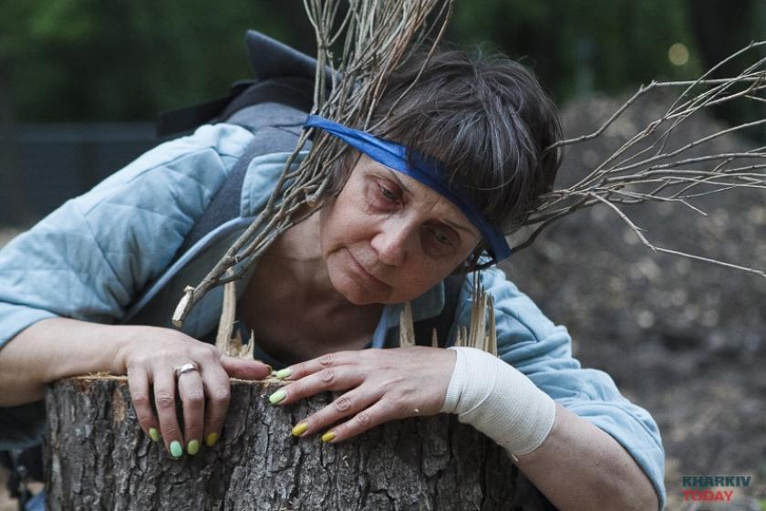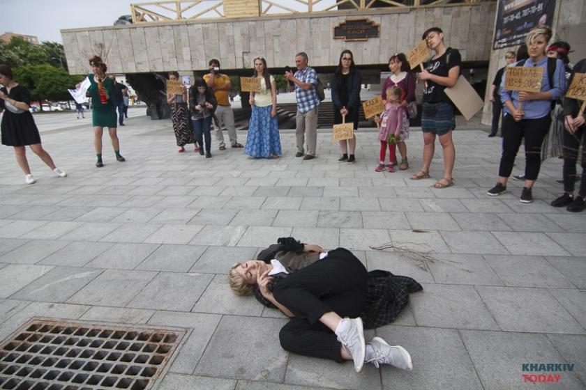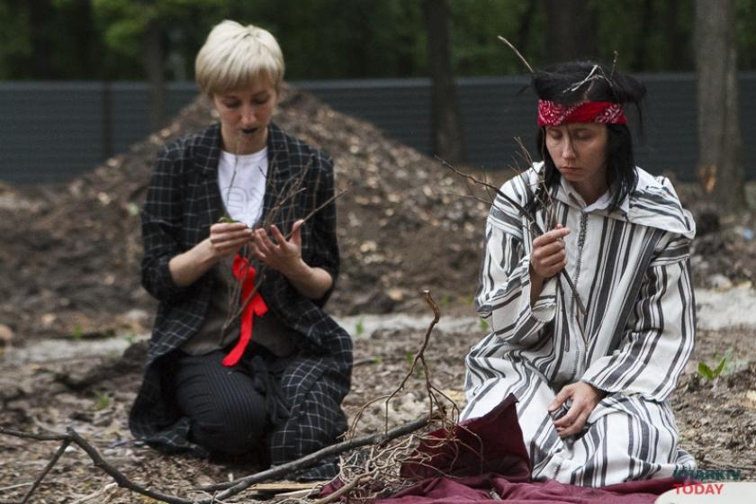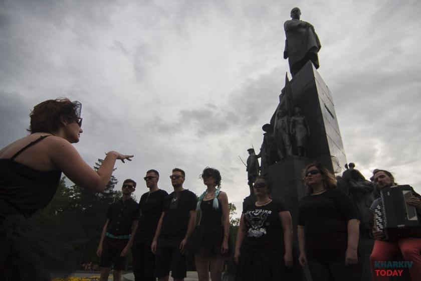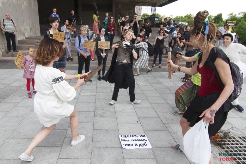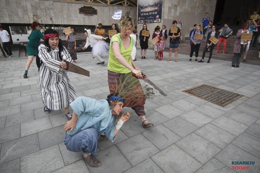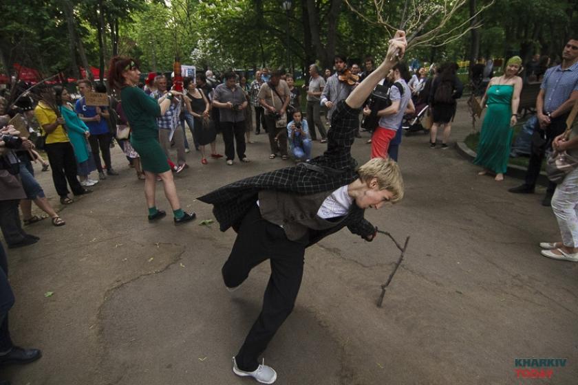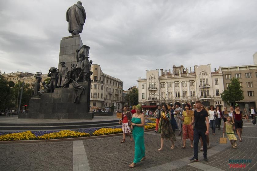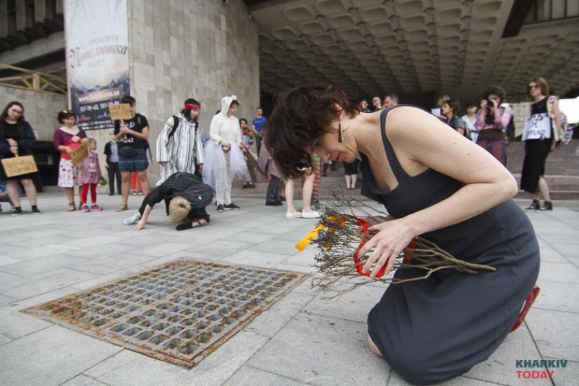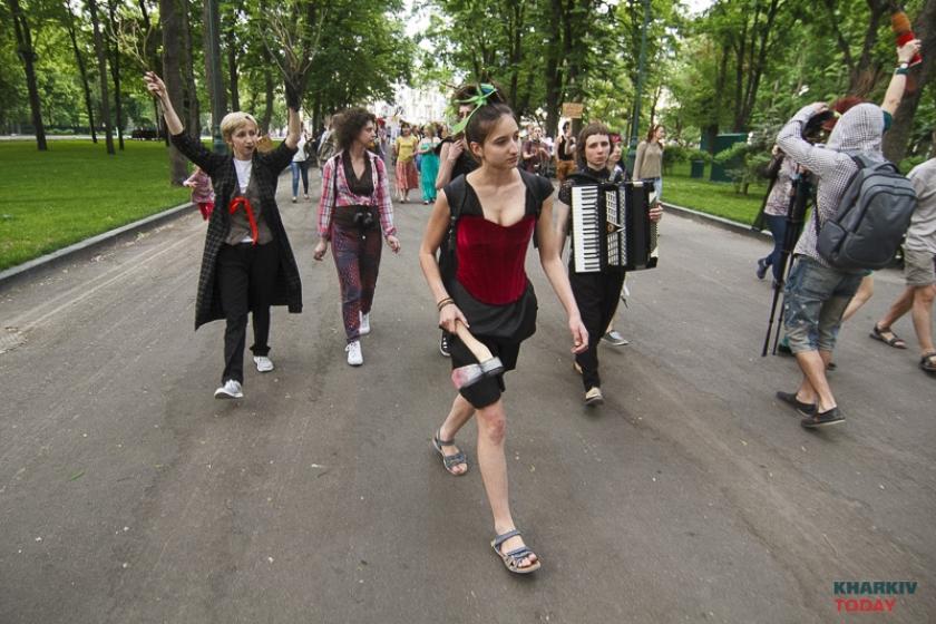 Участники перформанса прошли от ХНАТОБа по саду Шевченко в сторону кафе "Кристалл" с остановками в пути, танцевали и пели народные песни, затем вышли к началу улицы Рымарской.
