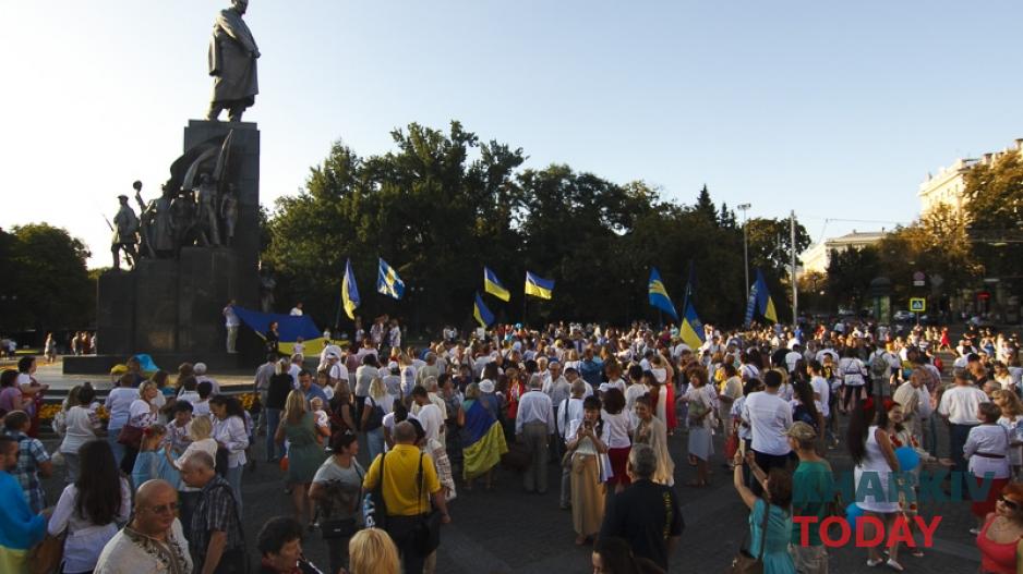 Около двух тысяч людей собрались на площади Конституции, а затем по улице Сумской прошли до памятника Тарасу Шевченко. Здесь прочитали стихи, вместе спели гимн Украины, а организаторы всех поблагодарили за участие в параде, который перешел в стадию свободного общения.