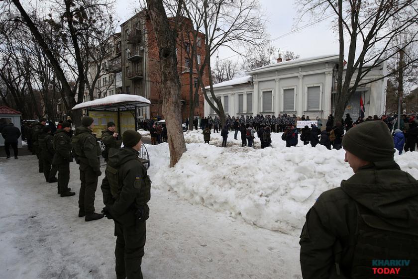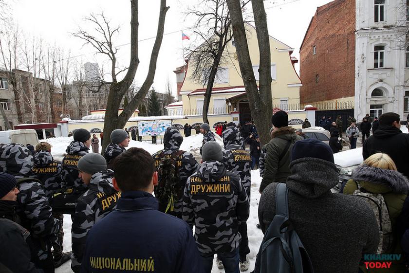 В Харькове 8 февраля активисты пикетируют консульство России. Как сообщает корреспондент Kharkiv Today, около стен здания консульства собрались около 40 человек, в их числе представители Национальной дружины и Национального корпуса. Также сообщается, что здание консульства РФ оцепили военнослужащие Национальной гвардии Украины, в целях охраны порядка.