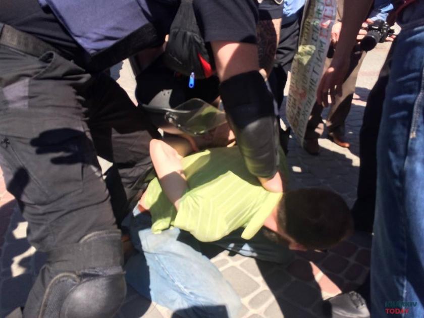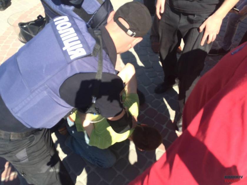 Контроль за порядком обеспечивают сотрудники нацполиции. Когда участники шествия построились в колонну и начали движение, один из активистов облил их кефиром. Полиция задержала парня, который представился Вадимом Поздняковым. Он заявил, что участники акции - враги Украины, которые принимали участие в Антимайдане.