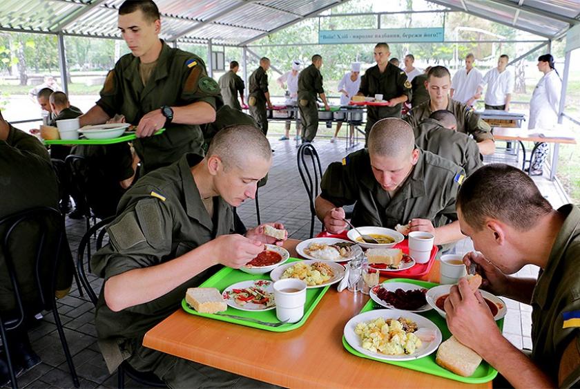 На прием пищи солдатам предлагают двойное меню, боец ​​может выбрать на обед борщ или суп, кашу гречневую или пшеничную, даже мясо предоставляется на выбор.