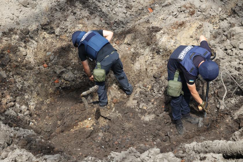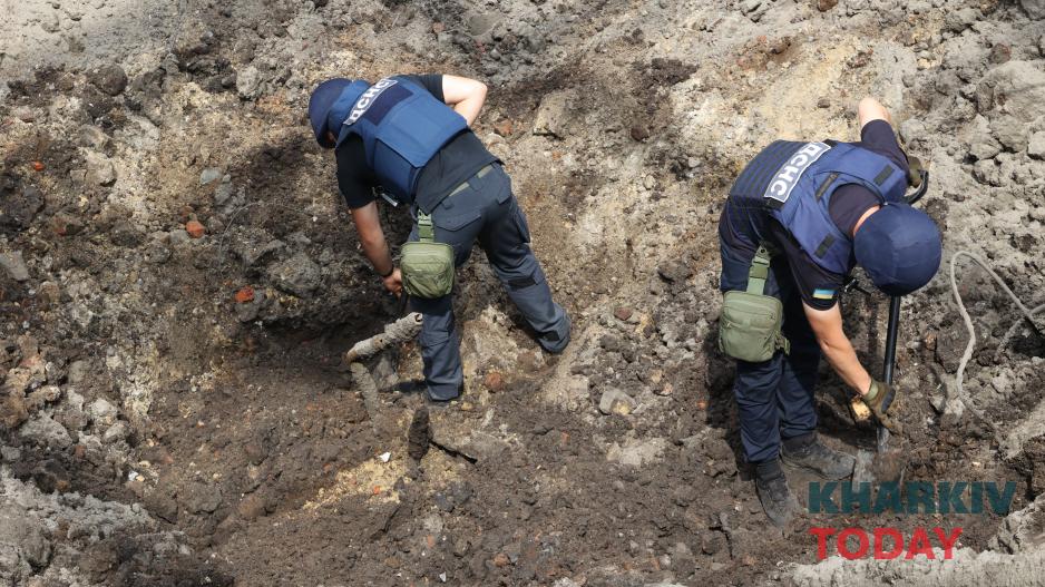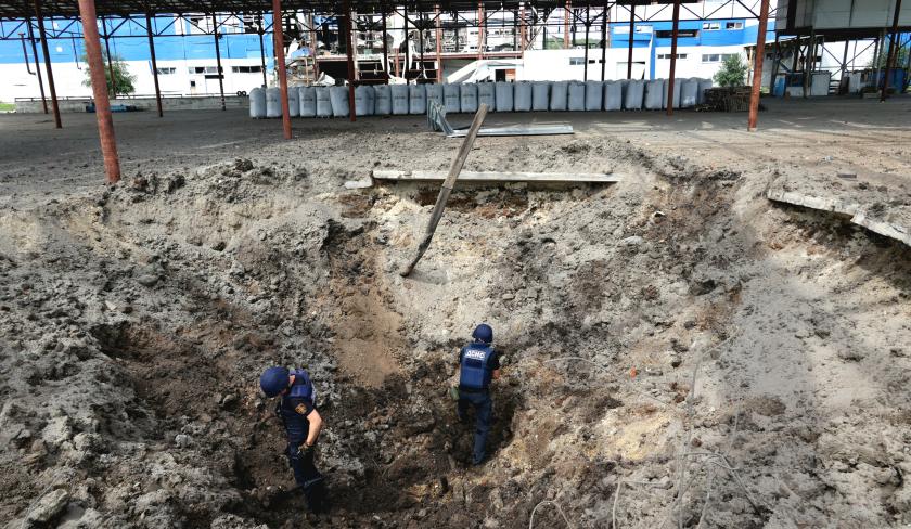 На месте попадания ракет образовалась большая воронка. Правоохранители собирают обломки и фиксируют нарушение законов и обычаев войны.