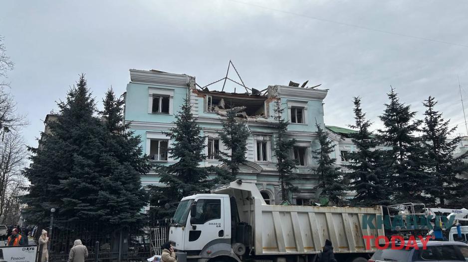 Больше всего здесь была поражена бывшая усадьба, а ныне здание Национальной академии правовых наук Украины. Вокруг здания изуродованные автомобили, вырванный с "корнем" забор, в черной саже фасад. Рядом и напротив на первых этажах приходят в себя от ракетной атаки владельцы маленьких кофеен, "Новой почты", отделений банков, косметологических салонов. Коммунальники помогают выгребать килограммы стекла и зашивать окна деревянными плитами. Также было повреждено общежитие Национальной юридической академии, в котором в то время никого не было.