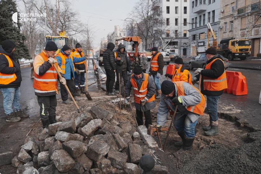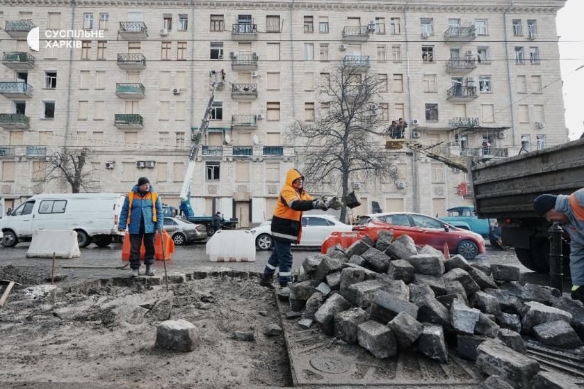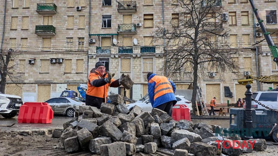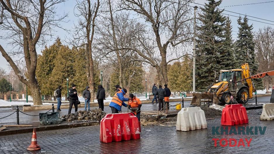 На Сумской возобновляют транспортную электросеть и мостовую, чтобы пустить транспорт. Коммунальник должен утрамбовать песок, чтобы укладывать брусчатку. Работы обещают скоро завершить.