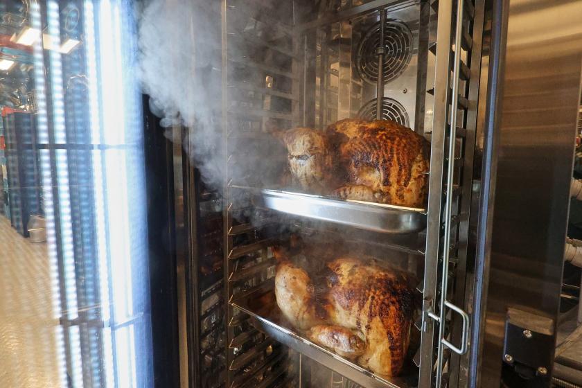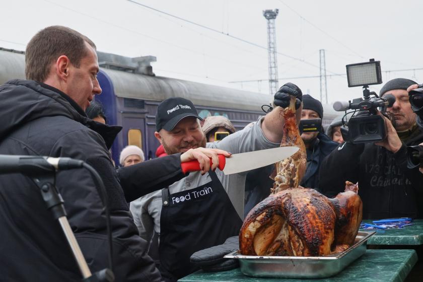 Сегодня повара поезда-кухни приготовили традиционные праздничные блюда США: запеченная индейка, картофель и тыквенный пирог. Их в боксах раздавали прямо на платформе.