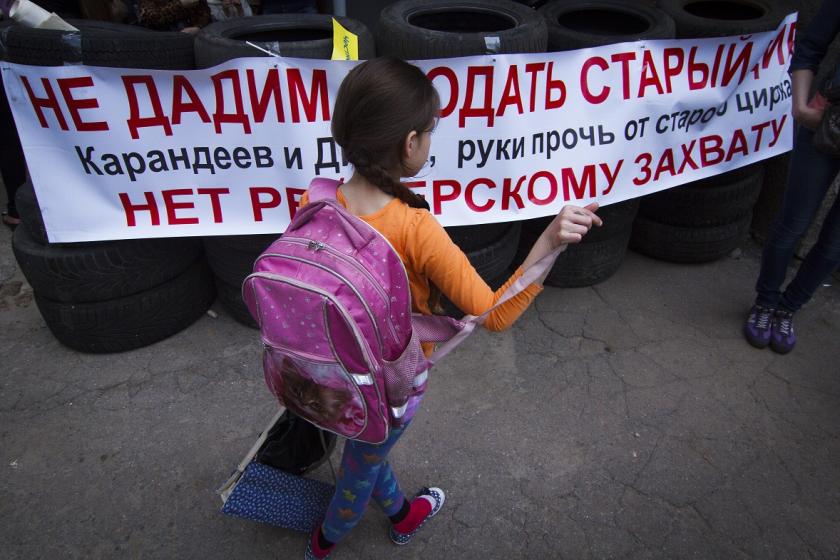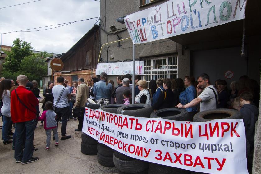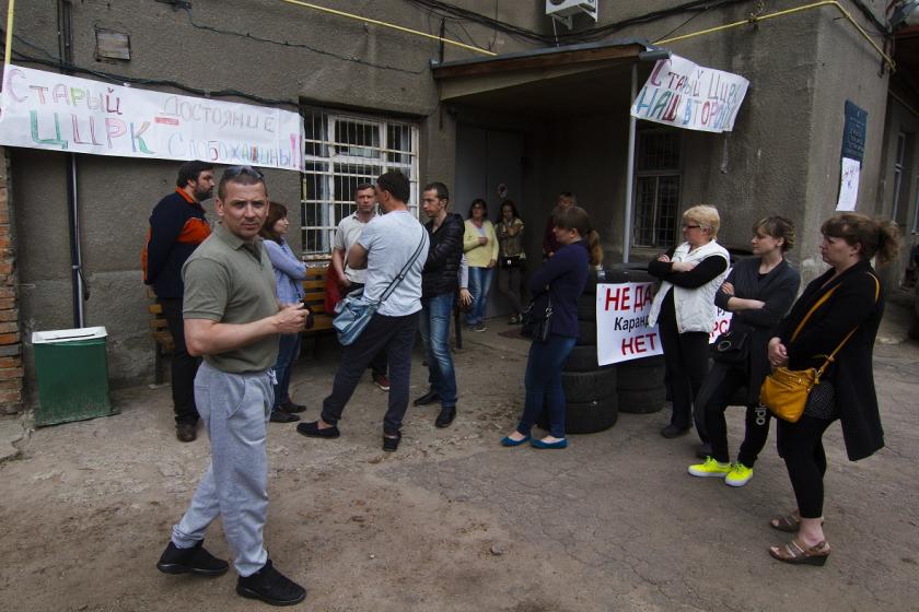 Вход в здание цирка забаррикадировали шинами, которые завесили плакатами "Не дадим продать Старый цирк" и "Нет рейдерскому захвату".