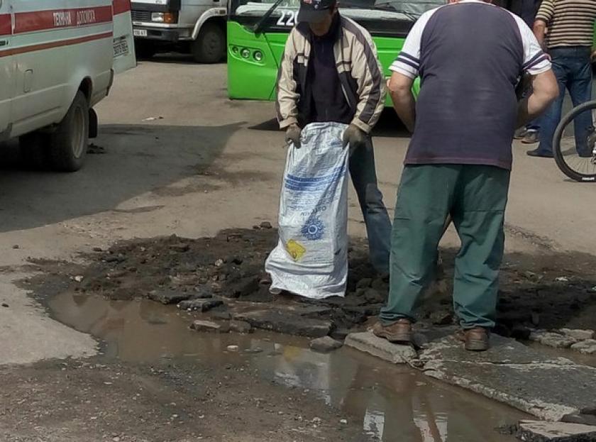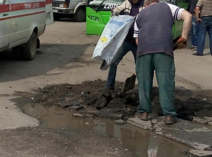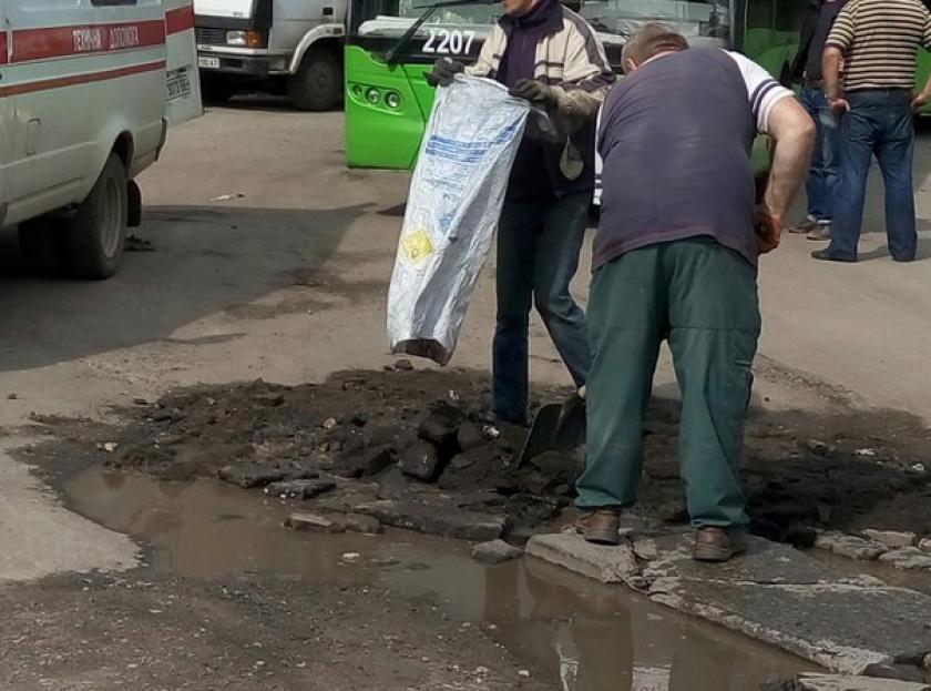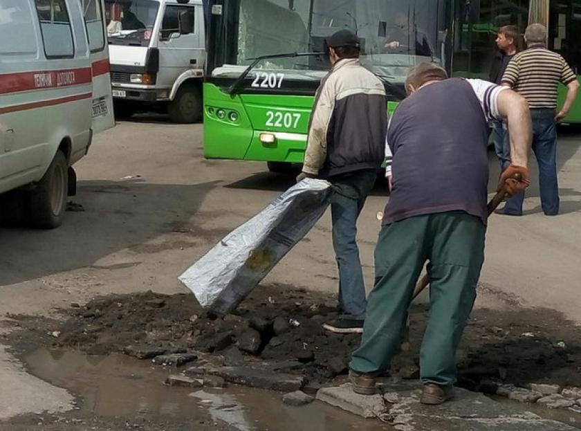 Какой именно материал высыпается в лужу из мешка – неизвестно, но  смесь похожа на асфальт, перемешанный с землей. Впрочем, что это за ремонтники – тоже  вопрос, так как отличительных знаков коммунальщиков Харькова на них нет.