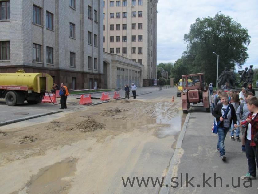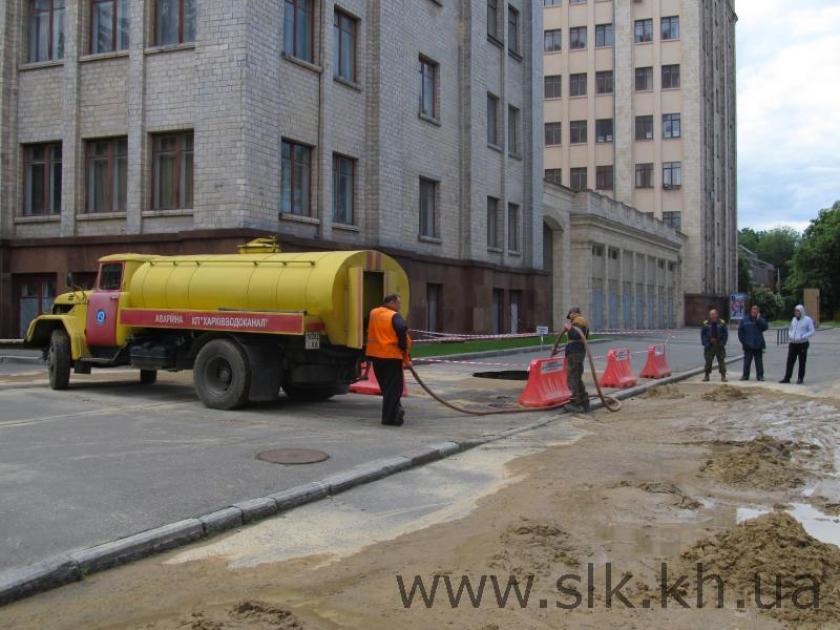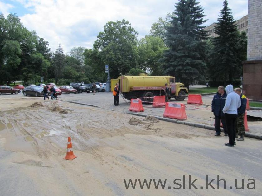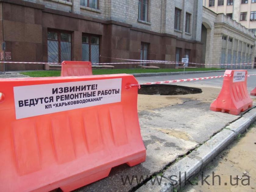 Сегодня утром возле главного корпуса Харьковского национального университета имени Каразина в результате провала асфальта образовалась большая яма.