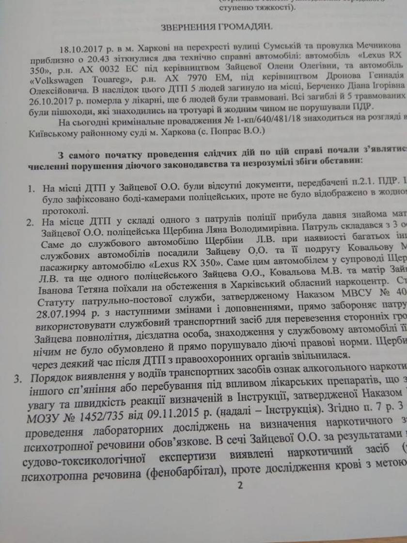 Пострадавшие и родственники погибших в ДТП, которое произошло 18 октября на улице Сумской в Харькове, в коллективной жалобе рассказали о многочисленных нарушениях во время расследования аварии и попросили Администрацию Президента взять на контроль рассмотрение этого дела.