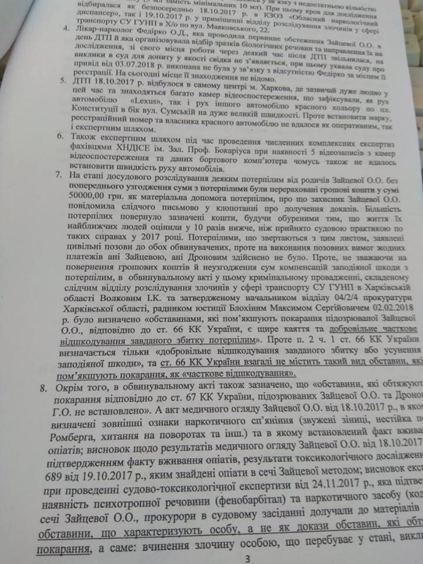 В жалобе говорится, что с самого начала расследование аварии, жертвами которой стали шесть пешеходов, происходило с нарушениями действующего законодательства. Ни в одном протоколе не зафиксировано, что Зайцева управляла Lexus без водительских прав, хотя камеры патрульных зафиксировали этот факт.
