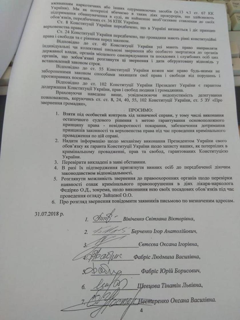 Эту жалобу подписали шесть человек. Среди них Оксана Евтеева, у которой в аварии погиб муж Александр Евтеев и спустя неделю после аварии в больнице умерла сестра Диана Берченко. Также жалобу подписал Игорь Берченко - отец погибшей Дианы и чудом выжившей Оксаны.