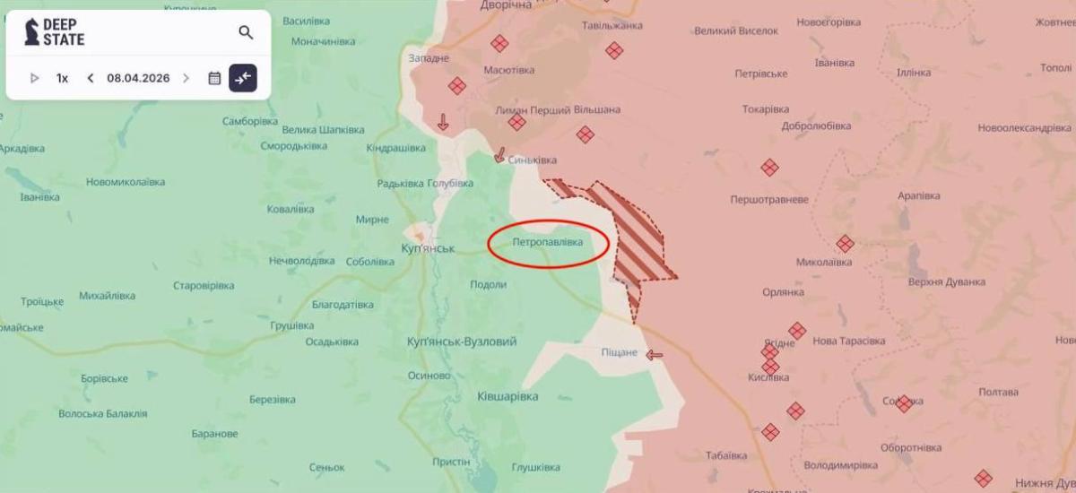 За даними аналітиків, ворог зміг захопити кілька квадратних кілометрів поблизу Петропавлівки. Село розташоване на схід від Куп’янська, за кілька кілометрів від його околиць на лівому березі Осколу.