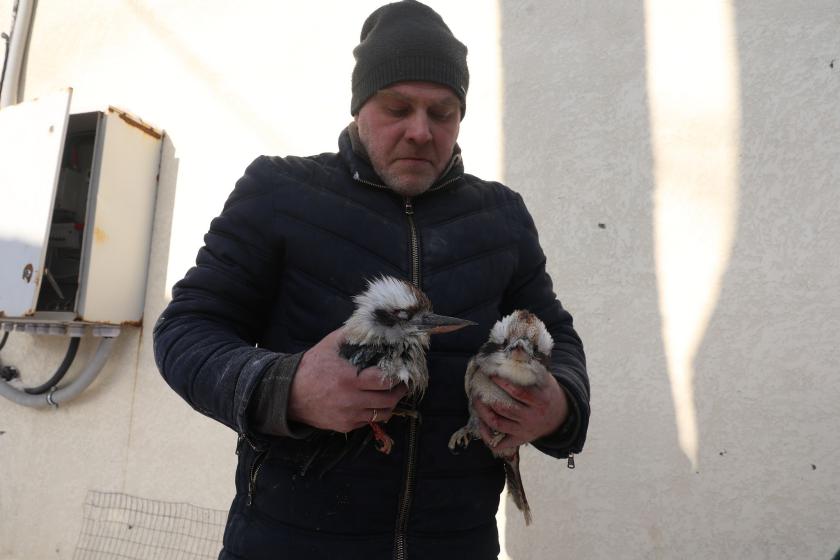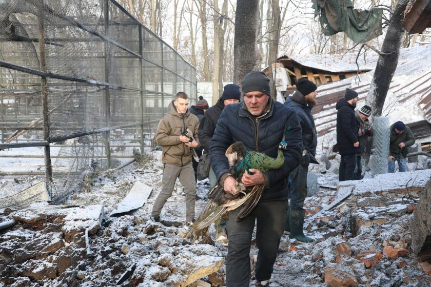 Співробітники екопарку переносять птахів до вцілілих приміщень. Павича вдалось зняти з дерева.