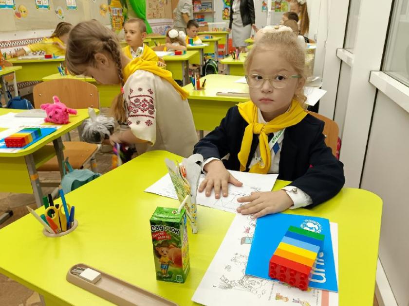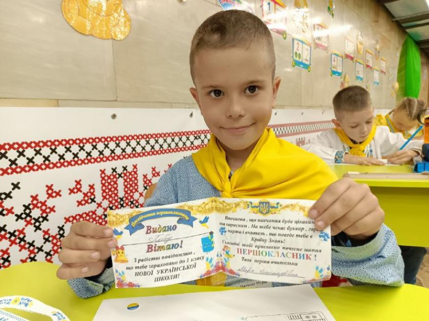 У сусідньому першому класі руханка. Діти стоять поміж парт, дивляться то на учительку, то на екран, де лунає жвава мелодія, повторюють рухи. По їхніх обличчях не сказати, що першачки втомилися до третього уроку. Здається, хтось уже знайшов собі приятелів, дівчатка одна одній показують наліпки, які в кінці робочого дня роздає у якості винагороди учитель. А Данило позує зі своїм першим документом, посвідченням першачка. Сьогодні він власноруч його розмалював і понесе додому, показувати батькам. Він обережно складає його до наплічника — так, ніби усе це відбувається за звичайних умов у звичайній харківській школі.