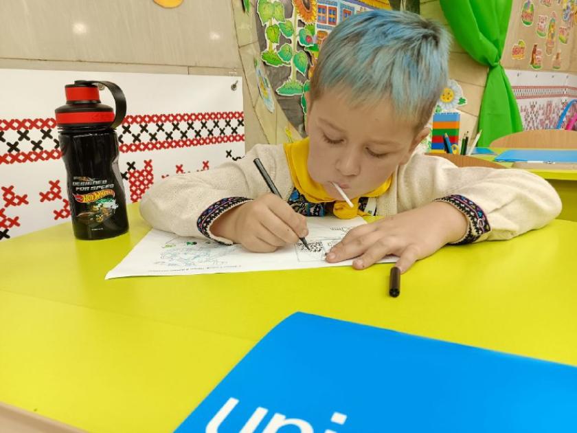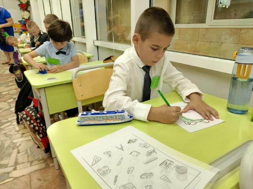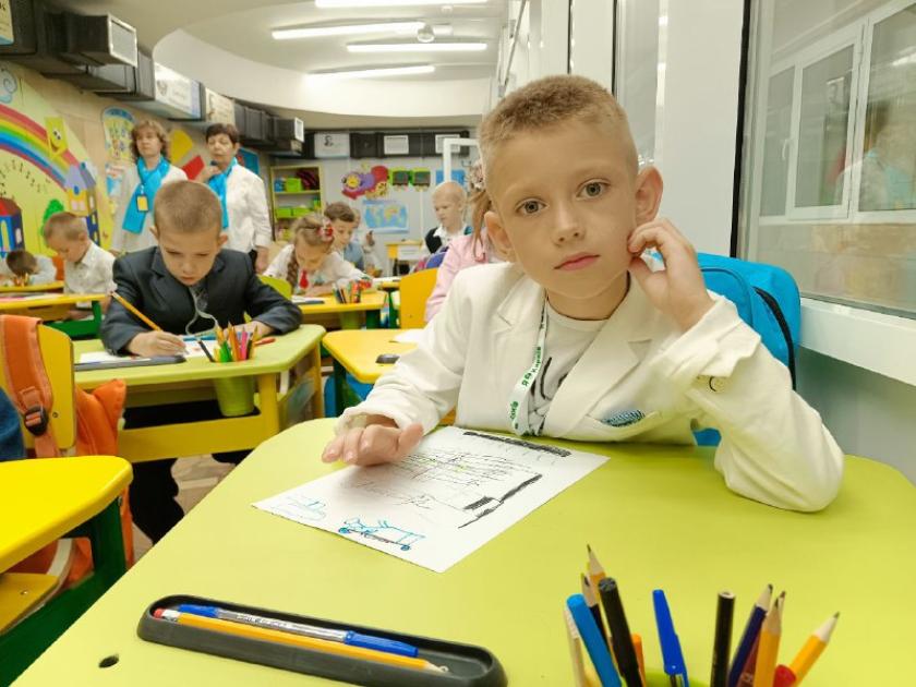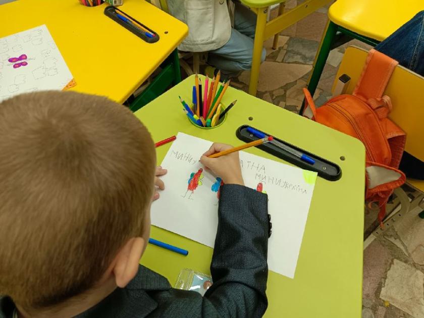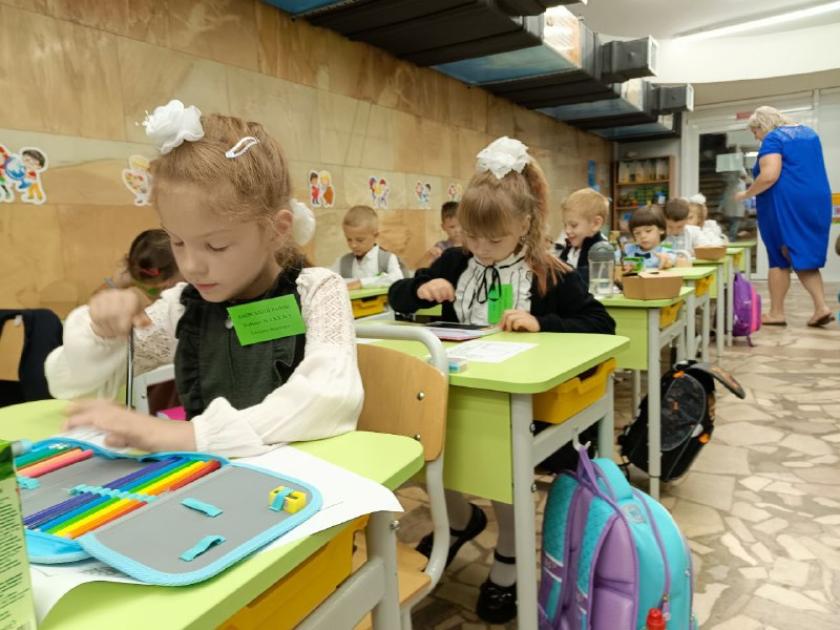 Їх у її першому метро-класі аж 24. Досвідчений педагог швидко повертає до себе увагу шестирічок. Тьютор, її помічник, роздає кожному учню на парту розмальовку. Діти мають олівчиками "заповнити" рюкзачок. Хтось малює шкільне приладдя, а хтось — український тризуб. Ось хлопчик виводить охайно олівцем на аркуші "Ми з України", і вчителька радіє: рука в дитини уже поставлена, він вміє писати.