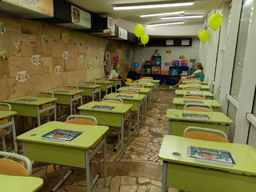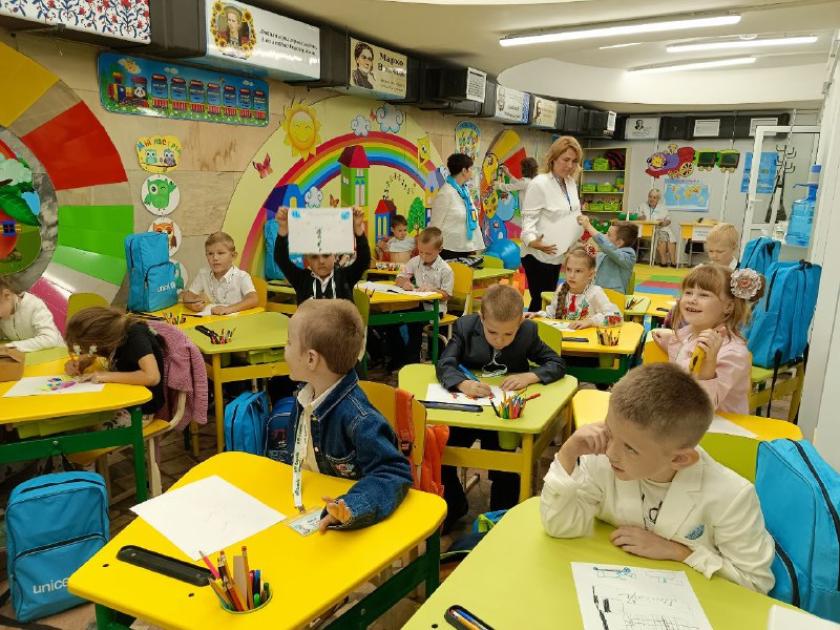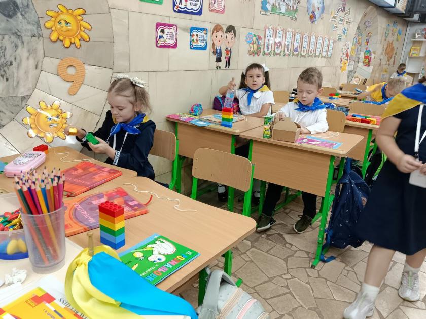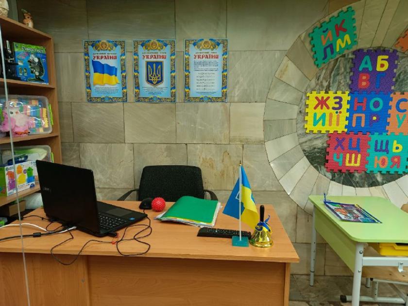 В інших класах сьогодні знайомилися, повторювали плоскі геометричні фігури, числа першого десятка, роздивлялися національні символи України. Усі класи у метро навчаються за програмою Нової української школи. У кабінетах, які швидко готували для навчання, зі стін дивляться корифеї української літератури: Тарас Шевченко, Іван Франко, Леся Українка.