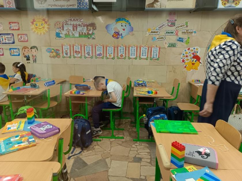 Учитель першої зміни, відпрацювавши, залишить кабінет у підзмеці своєму колезі з другої зміни. Робоче місце у педагогів маленьке, на столі, як завжди першого вересня, квіти. Під рукою немає звичних дидактичних матеріалів: їх просто нікуди складати, класи у метро дуже маленькі. Але головне, кажуть педагоги, що на них знову дивляться дитячі оченята — не через екран. Потихеньку учителі обіймають малечу, коли хочуть підбадьорити або сказати тепло слово. Так було під час навчання до повномасштабної війни.