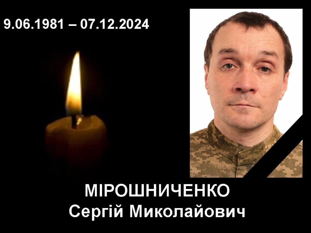 Сергій Мірошниченко рано залишився без батьків: він ріс у дитячому будинку. Згодом хлопчика усиновила багатодітна сім’я Меланії Тхір з села Баранове. Сергій закінчив школу та ПТУ, працював різноробом та охоронником. Від початку російської війни він став на захисту України, а з початком повномасштабного вторгнення у 2022 році знову взяв зброю до рук.