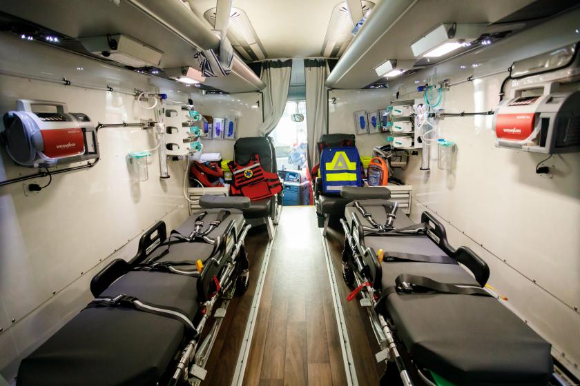 Реанімаційний автобус розрахований на перевезення п'яти лежачих пацієнтів. Також у ньому є 20 місць для сидіння та дитячі крісла. В автобусі можуть перевозити пацієнтів з різними нозологічними патологіями. У ньому встановлені дев'ять інфузоматів, монітор пацієнта та апарати штучної вентиляції легенів для кожного пацієнта. Для роботи в такому автобусі медики проходили навчання у Польщі.