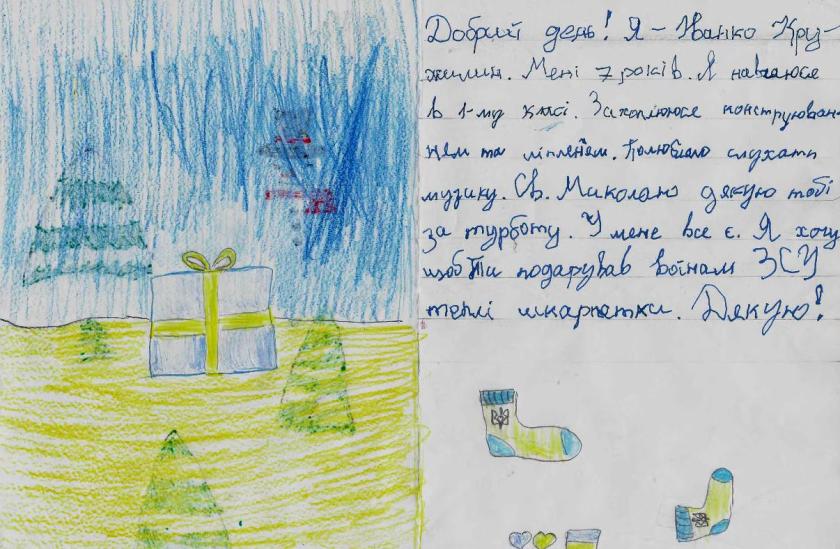 "У мене все є, я хочу, щоб ти подарував воїнам ЗСУ теплі шкарпетки", — просить 7-річний Іванко з Харківщини.