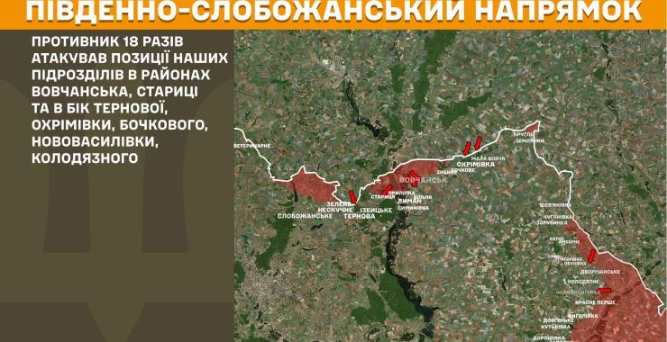 "На Південно-Слобожанському напрямку противник 18 разів атакував позиції наших підрозділів в районах Вовчанська, Стариці та в бік Тернової, Охрімівки, Бочкового, Нововасилівки, Колодязного На Куп’янському напрямку ворог чотири рази атакував у районах Новоосинового, Кіндрашівки та в бік Куп’янська, Ківшарівки", — йдеться у зведенні Генштабу.