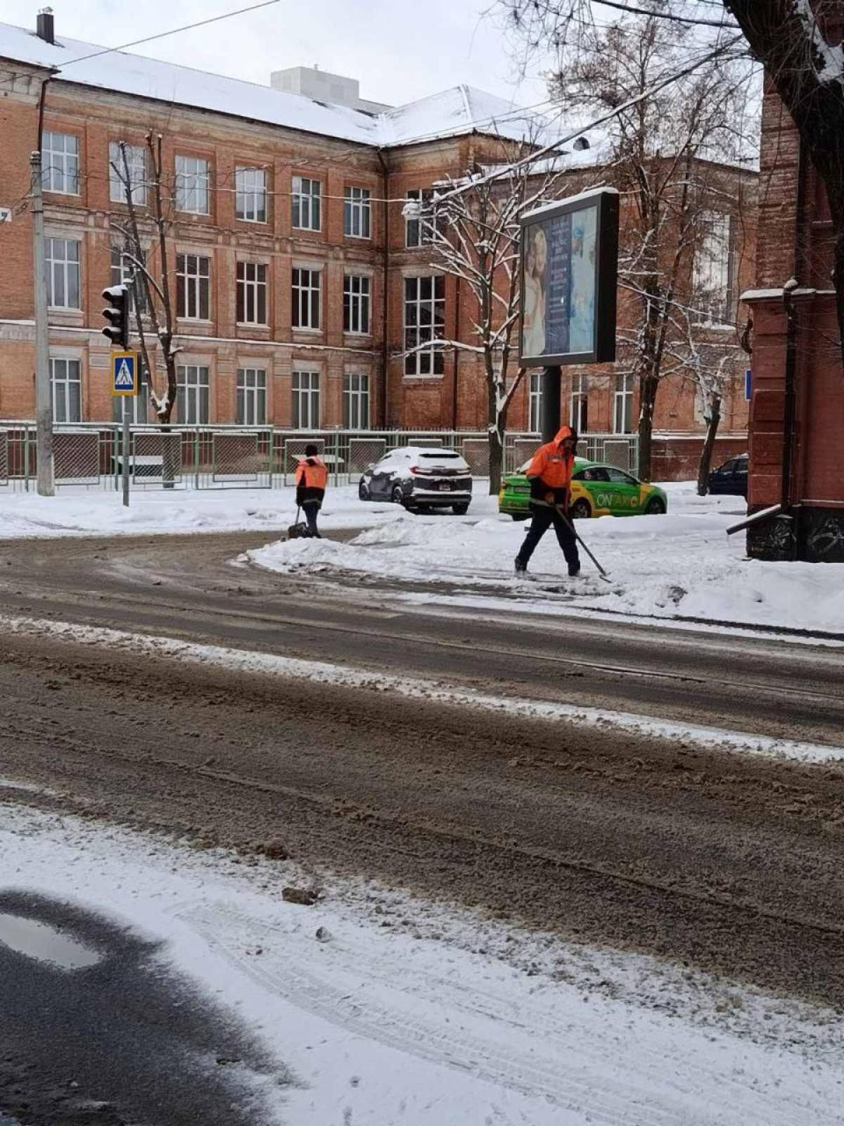 "Комунальники прибирають на дорогах, пішохідних доріжках і тротуарах, внутрішньоквартальних проїздах, біля виходів з під’їздів, підходів до бюветів, сміттєвих контейнерів", — розповіли в пресслужбі Харківської міської ради.