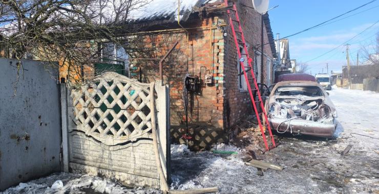У будинку пошкоджені дах, вікна та фасад, а також легковий автомобіль поруч та газові мережі.