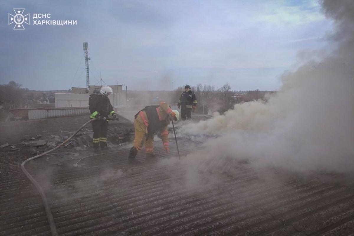 "Внаслідок влучання виникла пожежа — горіли конструктивні елементи даху на площі 30 м кв. На місці події, попри загрозу повторних ворожих обстрілів, працювали підрозділи ДСНС. До ліквідації наслідків залучались 7 рятувальників та 2 одиниці техніки, а також медичний розрахунок і офіцер-рятувальник громади", — розказали у ГУ ДСНС Харківщини.