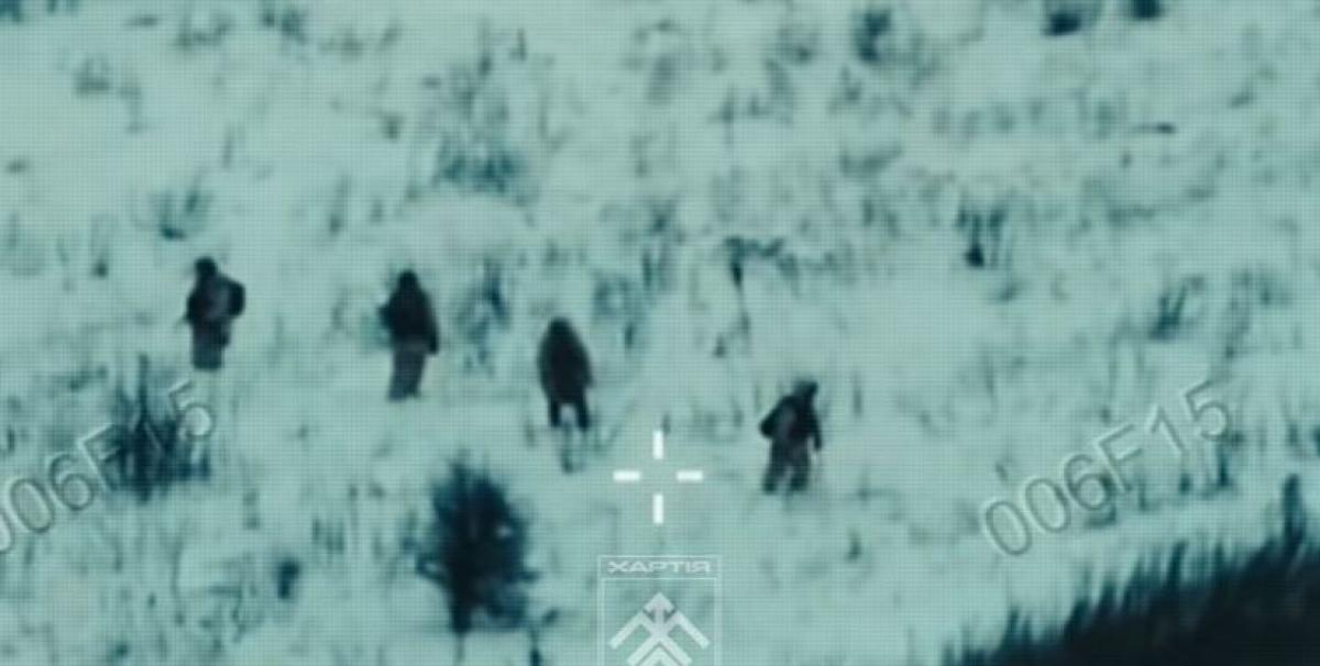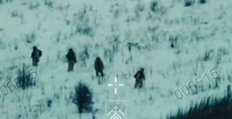На відео, яке зняли оператори безпілотників бригади Нацгварії "Хартія" видно, як окупанти у складі малої піхотної групи один за одним просуваються по засніженому полю. Але поступово групу знищують за допомогою ударних безпілотників.