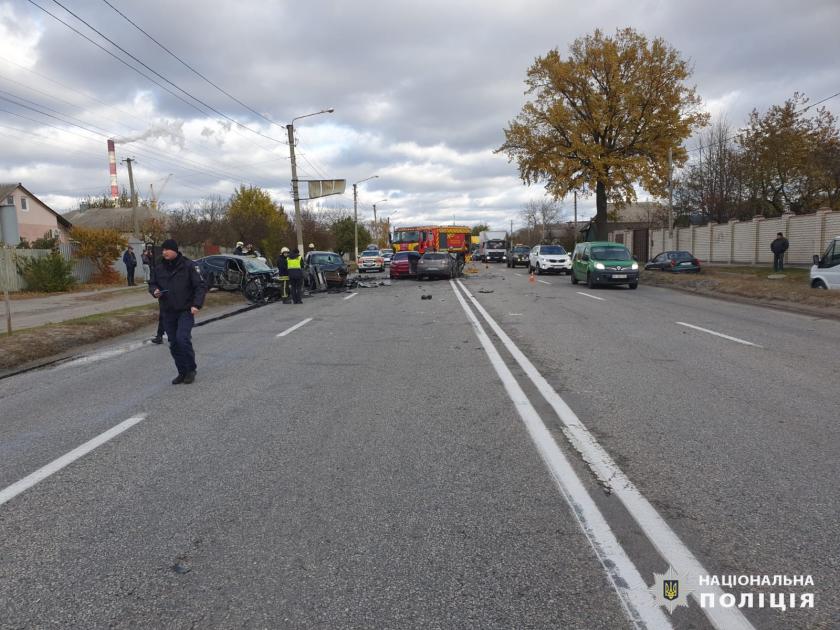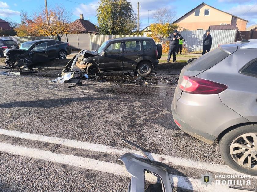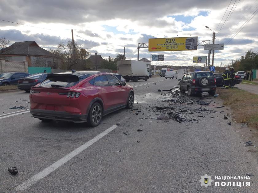 "Встановлено, що водій Lexus не впорався з керуванням та виїхав на зустрічну смугу руху, де зіштовхнувся з Renault Megane та Chevrolet Niva. Потім автомобіль Renault в некерованому стані зіштовхнувся з Ford Mustang. На місці події загинула 47-річна пасажирка транспортного засобу Renault. З травмами різного ступеня тяжкості доставлені до лікарні водії автомобілів Lexus, Renault, Chevrolet, а також пасажир Chevrolet", — розповіли у Головному управлінні Нацполіції Харківщини.