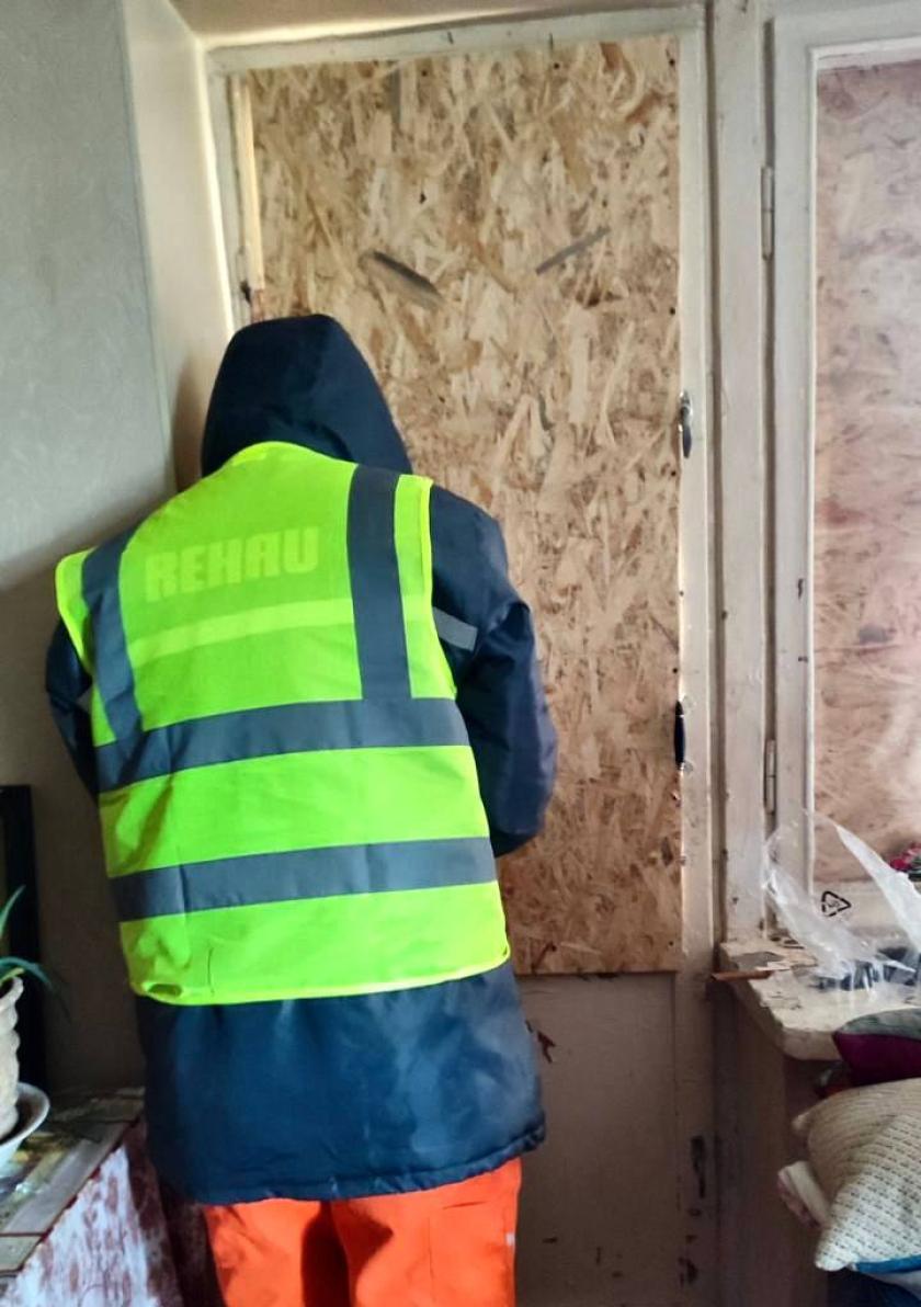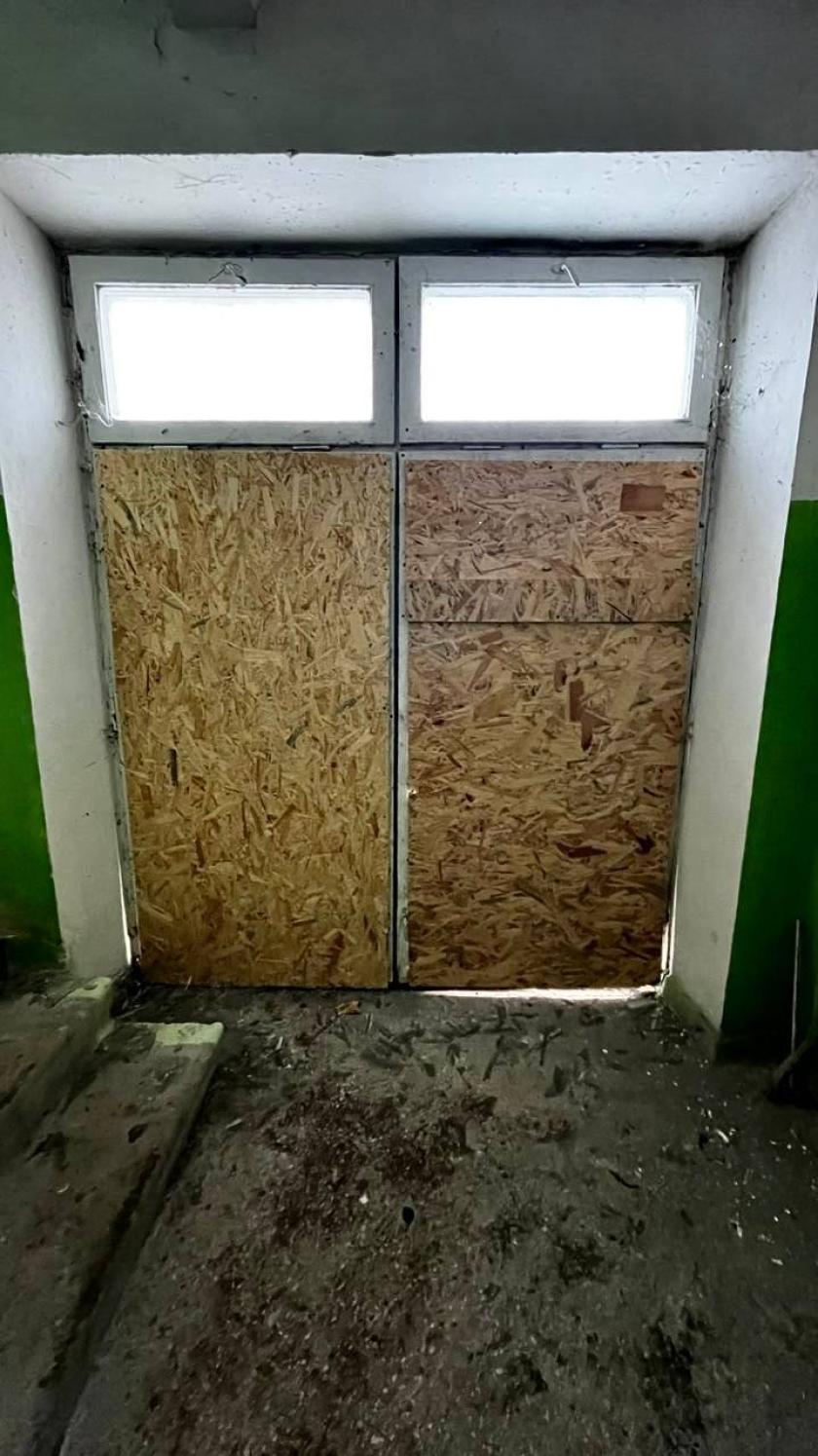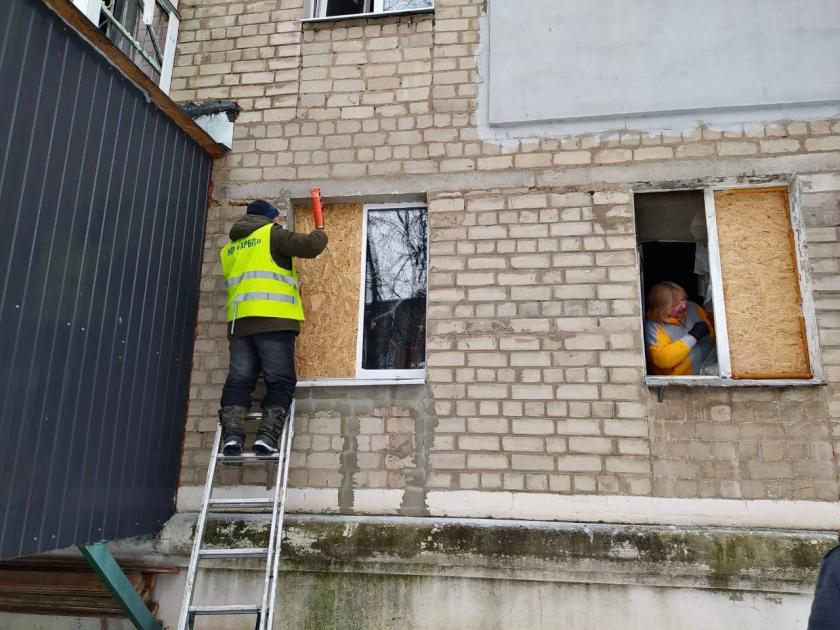 У будівлях вибиті 3400 вікон. Співробітники комунальних підприємств "Харківспецбуд", "Харківське ремонтно-будівельне підприємство" та "Харківжитлобуд" допомагають закрити вікна листами ОСБ.