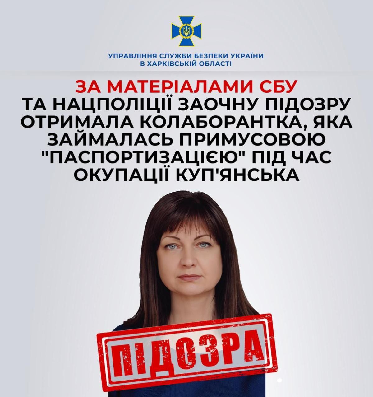 "Встановлено, що на початку повномасштабного вторгнення фігурантка, за протекцією окупаційної адміністрації Харківщини, влітку 2022 року отримала «посаду» в так званому "мвс рф". Фейкова "міграційна служба управління внутрішніх справ" функціонувала на базі захопленого рашистами Куп’янського районного відділу поліції. Саме там окупанти організували незаконну паспортизацію місцевого населення. За даними слідства, колаборантка здійснювала прийом громадян для оформлення заяв на отримання російських паспортів, збирала персональні дані мешканців для прискорення примусової паспортизації, а також перекладала документи з української на російську та займалася їх оформленням", - повідомив речник УБСУ Харківщини Владислав Абдула.