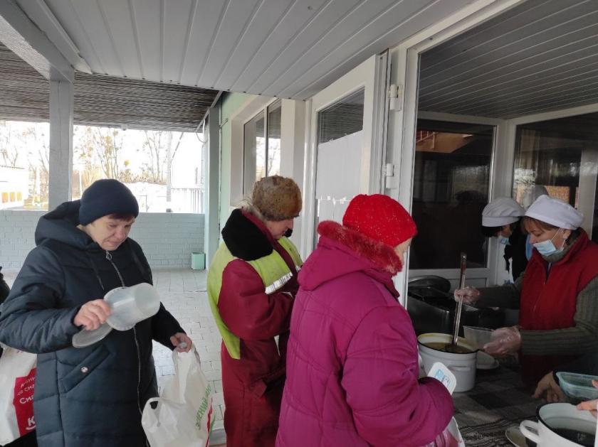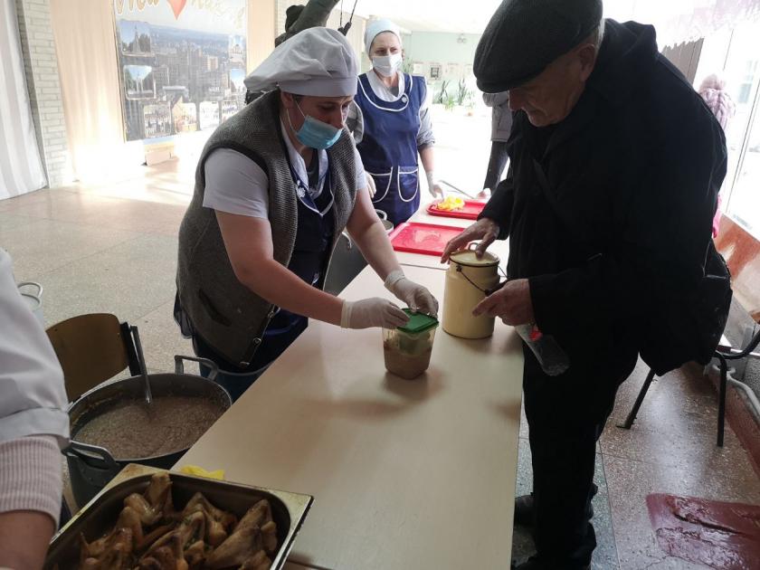 За продуктами треба йти з власною тарою, тож люди зранку вишикувалися в черги зі скляними банками, залізними бідонами та пластиковими судками. Переважна більшість відвідувачів таких пунктів — пенсіонери, які через комунальні негаразди не можуть приготувати обід вдома.