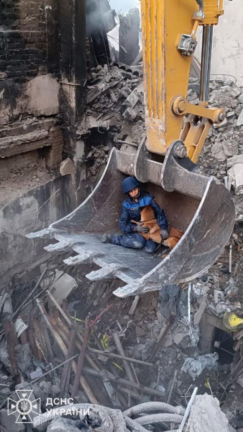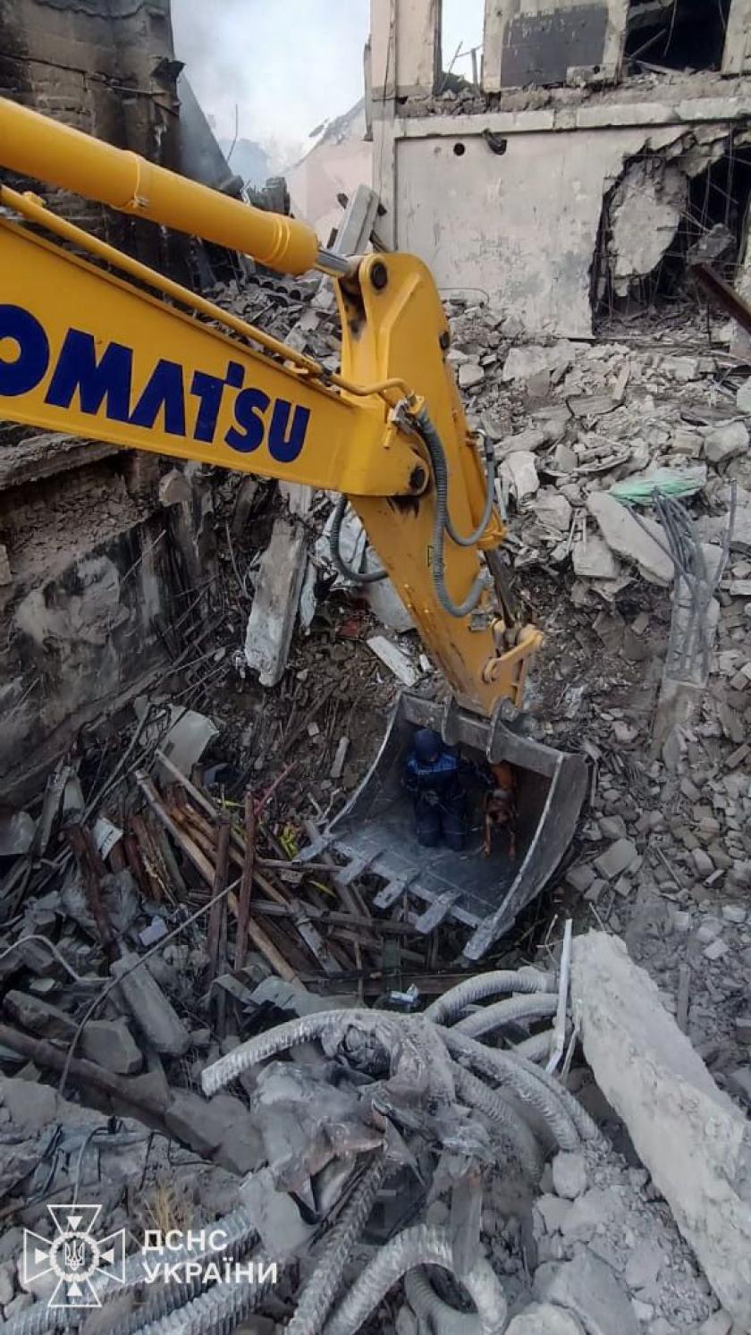 Кінологів із службовими собаками спускають спецтехнікою до підвалу, де, імовірно, перебували шестеро співробітників під час атаки на підприємство. Як писав KHARKIV Today, рятувальники змогли побачити тіло одного із загиблих. Проте, каже речник ГУ ДСНС Харківщини Євген Василенко, змоги деблокувати його поки що немає.