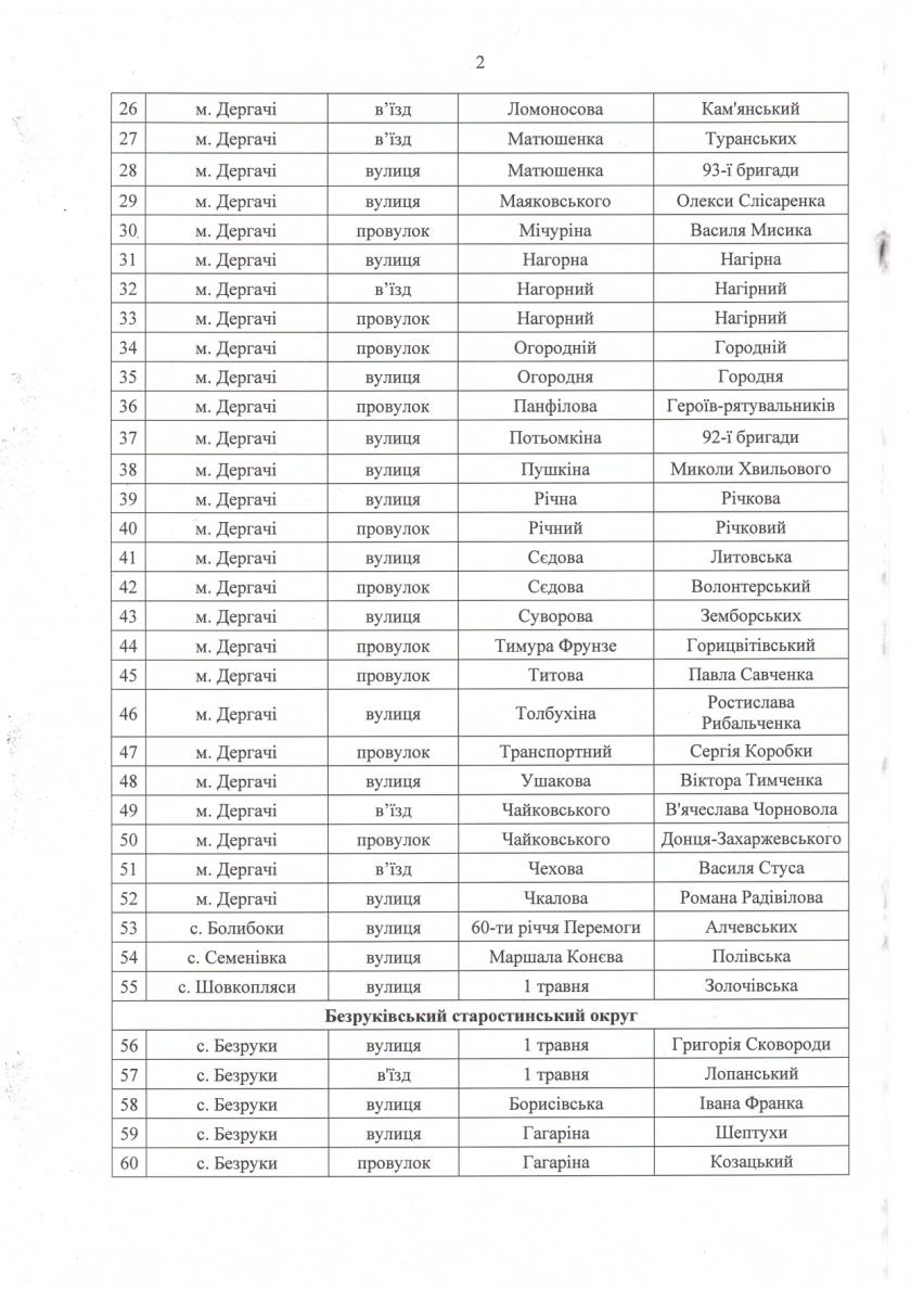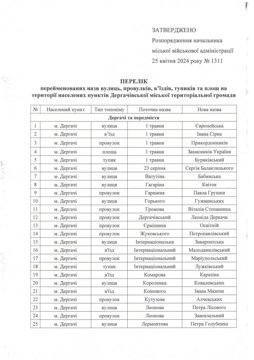Як повідомили у Дергачівській міській раді, у нових назвах враховано пропозиції громадськості, що надійшли під час громадських обговорень, проведених у червні-липні минулого року, а також пропозиції членів топонімічної комісії та експертні рекомендації Українського інституту національної пам’яті.