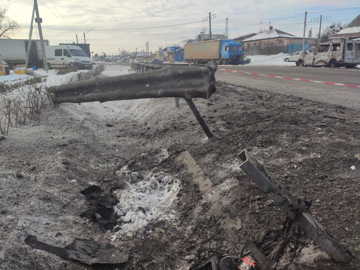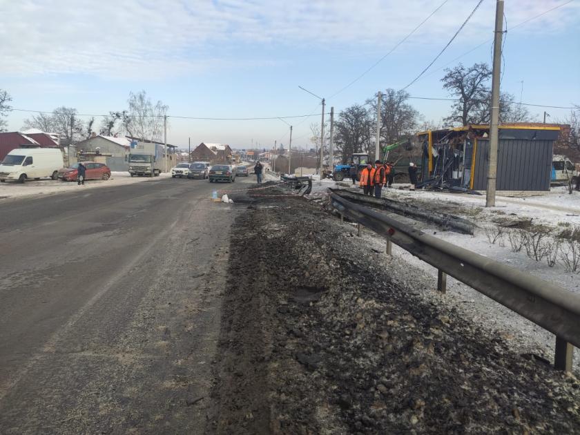 На місце події вранці 20 січня прибули робітники Служби відновлення та розвитку інфраструктури. На фото. які оприлюднила Служба, видно, що пошкодження від удару дрона невелике за діаметром, але досить глибоке. Були також пошкоджені зупинка та огородження вздовж траси.
